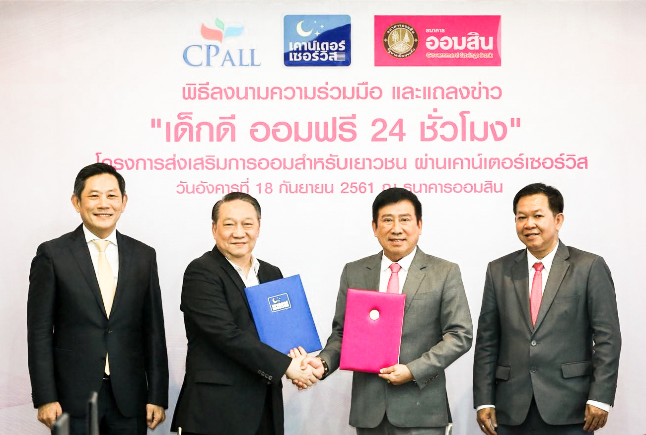 18 กันยายน 2561 : นายชาติชาย พยุหนาวีชัย ผู้อำนวยกาธนาคารออมสิน กล่าวว่า ออมสิน จับมือ ซีพี ออลล์ และเคาน์เตอร์เซอร์วิส จัดทำโครงการส่งเสริมการออมสำหรับเยาวชน “เด็กดี ออมฟรี 24 ชั่วโมง” ผ่านเคาน์เตอร์เซอร์วิส ร่วมส่งเสริมเยาวชนไทยรักการออม