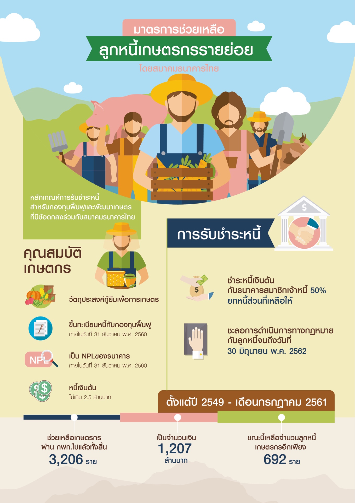 ซึ่งที่ผ่านมาธนาคารสมาชิกได้ให้การดูแลช่วยเหลือในการพิจารณาปรับปรุงหลักเกณฑ์เพื่อให้ลูกหนี้เกษตรกรรายย่อยที่เดือดร้อนกลุ่มนี้มาชำระหนี้กับธนาคารโดยตรง ภายใต้เงื่อนไขข้อตกลงที่สมาคมธนาคารกับ กฟก. เห็นชอบร่วมกัน และ