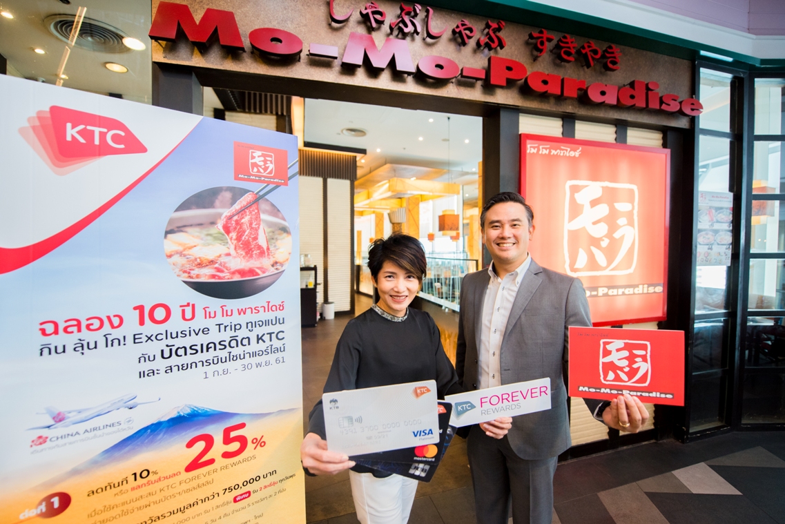 25 กันยายน 2561 : นางประณยา นิถานานนท์ ผู้อำนวยการ – ธุรกิจบัตรเครดิต “เคทีซี” หรือ บริษัท บัตรกรุงไทย จำกัด (มหาชน) ร่วมกับนายสุรเวช เตลาน กรรมการผู้จัดการ บริษัท โนเบิลเรสเตอท์รองต์ จำกัด เจ้าของแบรนด์ดัง “โมโมพาราไดซ์” (Momo Paradise) ร้านชาบู สุกี้น้ำดำ ต้นตำรับจากโตเกียว ในรูปแบบของ “All-You-Can-Eat” Shabu-Shabu & Sukiyaki จัดแคมเปญใหญ่ฉลองครบรอบ 10 ปี มอบสิทธิประโยชน์ให้สมาชิกบัตรเครดิตเคทีซีอิ่มสุดคุ้ม รับโชค 3 ต่อ ตั้งแต่วันที่ 1 กันยายน – 30 พฤศจิกายน 2561 ดังนี้