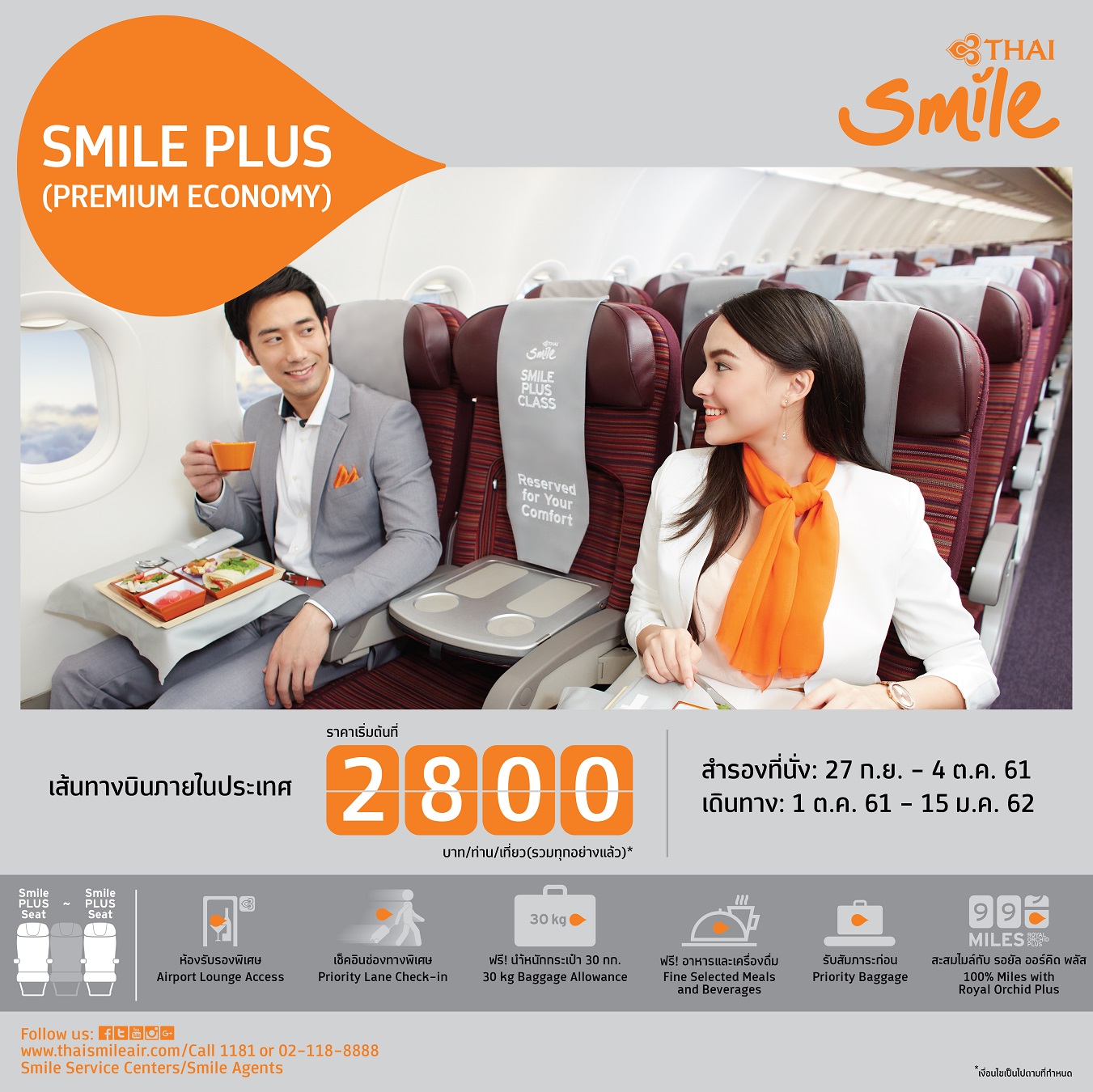 27 กันยายน 2561 : สายการบินไทยสมายล์ชวนสัมผัสประสบการณ์การบริการเหนือระดับในที่นั่งชั้นสมายล์ พลัส (Smile Plus) หรือ พรีเมี่ยม อีโคโนมี ด้วยโปรโมชั่นพิเศษ เส้นทางในประเทศ ราคาเริ่มต้น 2,800 บาท/ท่าน/เที่ยว (รวมทุกอย่างแล้ว) มาพร้อมบริการแบบฟูลเซอร์วิสและให้มากกว่าด้วยน้ำหนักสัมภาระ 30 กิโลกรัม บริการห้องรับรองพิเศษ บริการอาหารและเครื่องดื่ม บริการรับสัมภาระก่อน และสะสมไมล์กับ รอยัล ออร์คิด พลัส