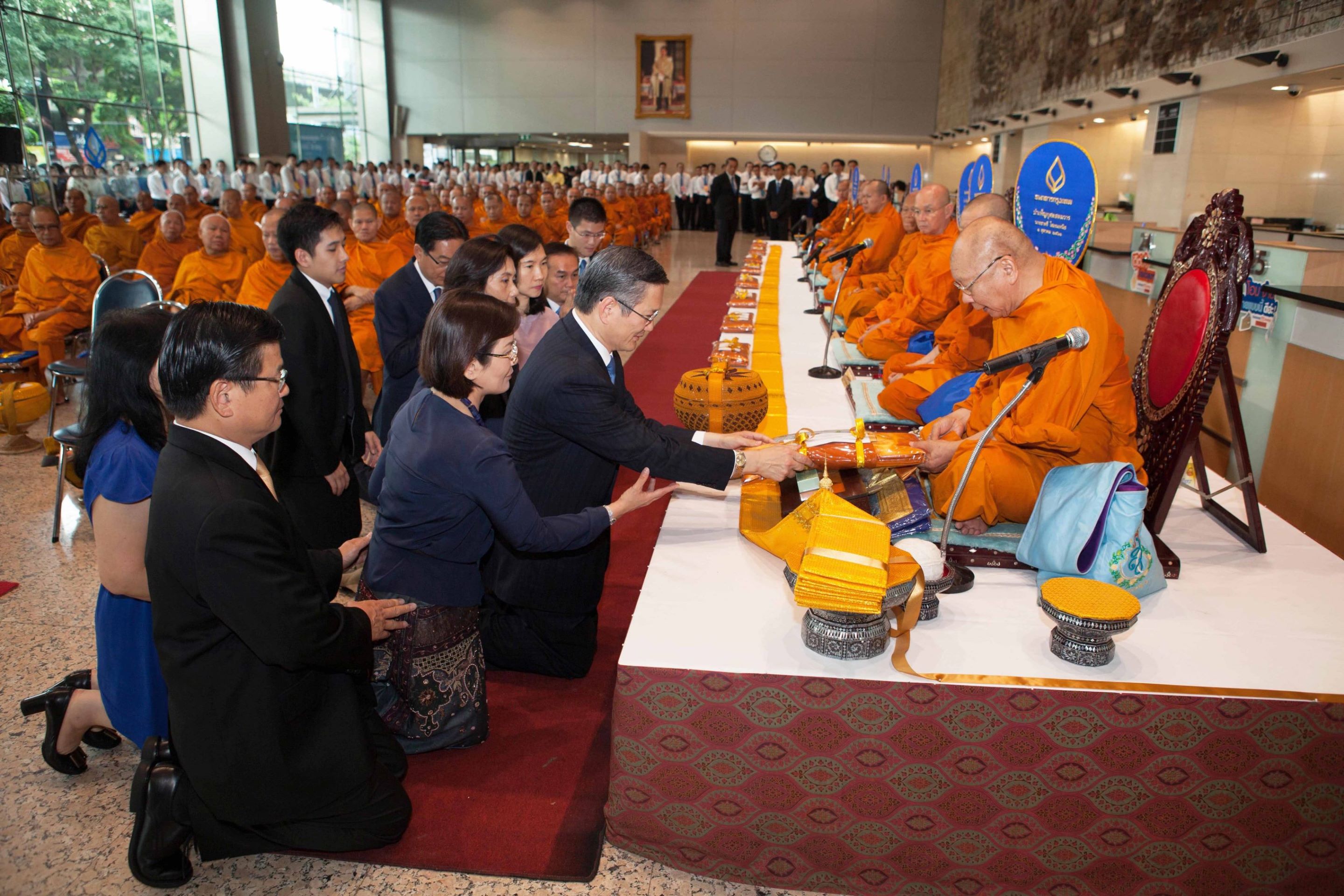 หลังจากนั้นได้จัดทำบุญตักบาตรพระสงฆ์ 100 รูป จาก 5 วัด ประกอบด้วย วัดยานนาวา วัดไตรมิตรวิทยารามวรวิหาร วัดจักรวรรดิราชาวาสวรมหาวิหาร วัดปทุมคงคาราชวรวิหาร และวัดราชสิงขร โดยมีนายเดชา ตุลานันท์ ประธานกรรมการบริหาร นายชาติศิริ โสภณพนิช กรรมการผู้จัดการใหญ่ พร้อมคณะกรรมการธนาคาร คณะผู้บริหาร พนักงานธนาคารกรุงเทพ และบริษัทในกลุ่ม ร่วมประกอบพิธีทำบุญอุทิศกุศล ณ บริเวณลานด้านหน้าอาคารสำนักงานใหญ่ ธนาคารกรุงเทพ ถนนสีลม![]()