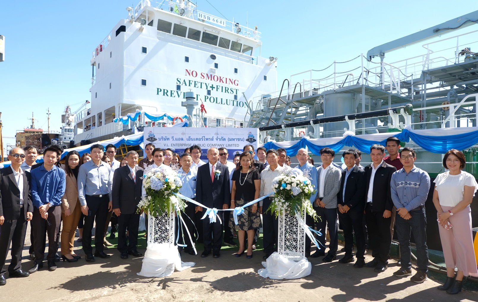 1 ตุลาคม 2561 : ชุติภา กลิ่นสุวรรณ (คนที่ 3 จากขวา) ประธานเจ้าหน้าที่บริหาร พร้อมด้วยผู้บริหาร บริษัท วี.แอล.เอ็นเตอร์ไพรส์ จำกัด (มหาชน) ร่วมพิธีทำบุญรับเรือใหม่ วี.แอล.20 ซึ่งมีน้ำหนักบรรทุก 5,578 เดทเวทตัน โดยมี พลเรือเอกไกรสร จันทร์สุวานิชย์ (คนที่ 4 จากซ้าย) ประธานกรรมการ บริษัท วี.แอล.เอ็นเตอร์ไพรส์ จำกัด (มหาชน) เป็นประธานในพิธีเปิดงาน ณ อู่อาชิม่า เมื่อเร็ว ๆ นี้ ![]()