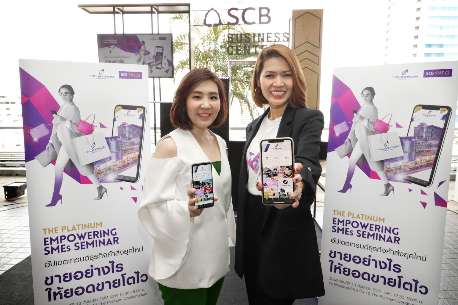 นอกจากนี้ยังจัดกิจกรรมสัมมนา “The Platinum Empowering SMEs” ครั้งที่ 2 (อัพเดทเทรนด์ธุรกิจค้าส่งยุคใหม่ ขายอย่างไร ให้ยอดขายโตไวอย่างก้าวกระโดด) เนื้อหาเจาะลึกครอบคลุมการวางกลยุทธ์ในการเลือกใช้เครื่องมือสื่อสารออนไลน์ให้มีประสิทธิภาพ เพิ่มทักษะในการสร้างแบรนด์ให้กับสินค้าและหาจุดขายสร้างความโดดเด่นให้กับสินค้า พร้อมจัดกิจกรรม Workshop เสริมทักษะการถ่ายภาพสินค้าให้โดนใจผู้บริโภค โดยมี นางสาวอรุณี บุญเกิด(ขวา) ผู้อำนวยการ SME Value Partner ธนาคารไทยพาณิชย์ จำกัด (มหาชน) และนางสาวปัณณิตา วรรณโกวิท (ซ้าย) ผู้อำนวยการฝ่ายการตลาด บริษัท เดอะ แพลทินัม กรุ๊ป จำกัด (มหาชน) ร่วมเปิดตัวกิจกรรม เมื่อเร็วๆ นี้ ![]()