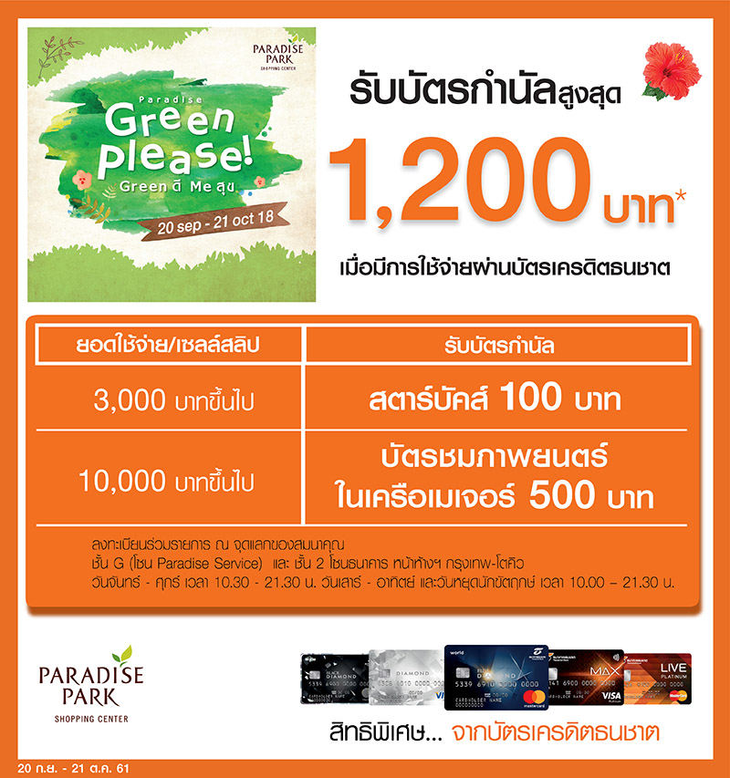 5 ตุลาคม 2561 : ธนาคารธนชาต จำกัด (มหาชน) เอาใจสายช็อปเพื่อสุขภาพ ร่วมแคมเปญ “Paradise Green Please : Green ดี Me สุข” ให้ลูกค้าบัตรเครดิตธนชาต ช็อปสินค้าจากร้านภายในศูนย์การค้าพาราไดซ์ พาร์ค รับบัตรกำนัลสูงสุด 1,200 บาท ถึงวันที่ 21 ตุลาคม 2561