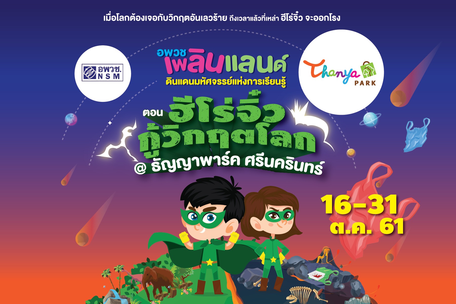 10 ตุลาคม 2561 : ศูนย์การค้า ธัญญาพาร์ค ศรีนครินทร์ ร่วมกับ องค์การพิพิธภัณฑ์วิทยาศาสตร์แห่งชาติ (อพวช.) ชวนน้องๆ แปลงร่างเป็นฮีโร่ในดวงใจออกมาพิทักษ์โลกกับกิจกรรม “อพวช.เพลินแลนด์ ดินแดนมหัศจรรย์แห่งการเรียนรู้ ครั้งที่ 2 ตอน ฮีโร่จิ๋วกู้วิกฤตโลก” ที่จะพาวัยจิ๋วออกไปเรียนรู้ปัญหาด้านสิ่งแวดล้อมที่ประเทศไทยและโลกกำลังเผชิญอยู่ในปัจจุบัน ผ่านนิทรรศการและการจำลองบรรยากาศใต้ท้องทะเลที่เต็มไปด้วยปัญหาขยะ พร้อมเรียนรู้หลักวิทยาศาสตร์กับการแก้ไขปัญหาด้านสิ่งแวดล้อมในโครงการพระราชดำริ เพื่อนำมาใช้กู้วิกฤตให้กับโลกของเรา ตั้งแต่วันที่ 16-31 ตุลาคม 2561 ณ ศูนย์การค้า ธัญญาพาร์ค ศรีนครินทร์