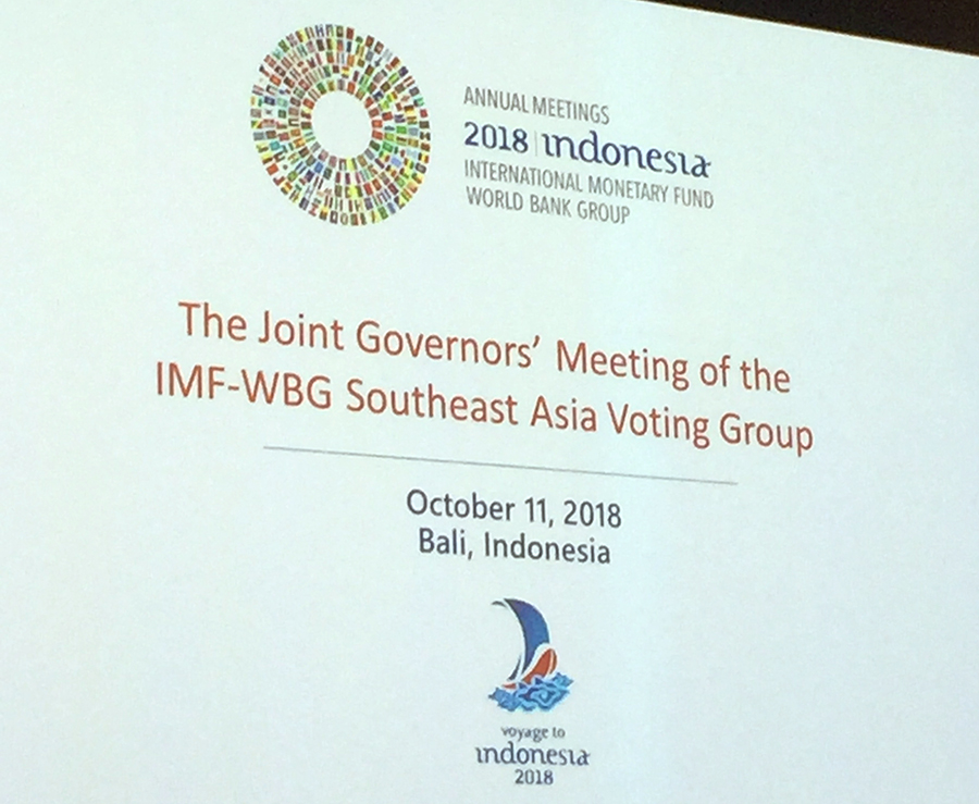 11 ตุลาคม 2561 : อภิศักดิ์ ตันติวรวงศ์ รัฐมนตรีว่าการกระทรวงการคลัง ร่วมการประชุมผู้ว่าการประเทศสมาชิกของกลุ่มออกเสียงเอเชียตะวันออกเฉียงใต้ของธนาคารโลกและกองทุนการเงินระหว่างประเทศ (IMF – WB Governors Joint Meeting of the South East Asia Voting Group) ณ เกาะบาหลี สาธารณรัฐอินโดนีเซีย เมื่อวันที่ 11 ตุลาคม 2561 ![]()