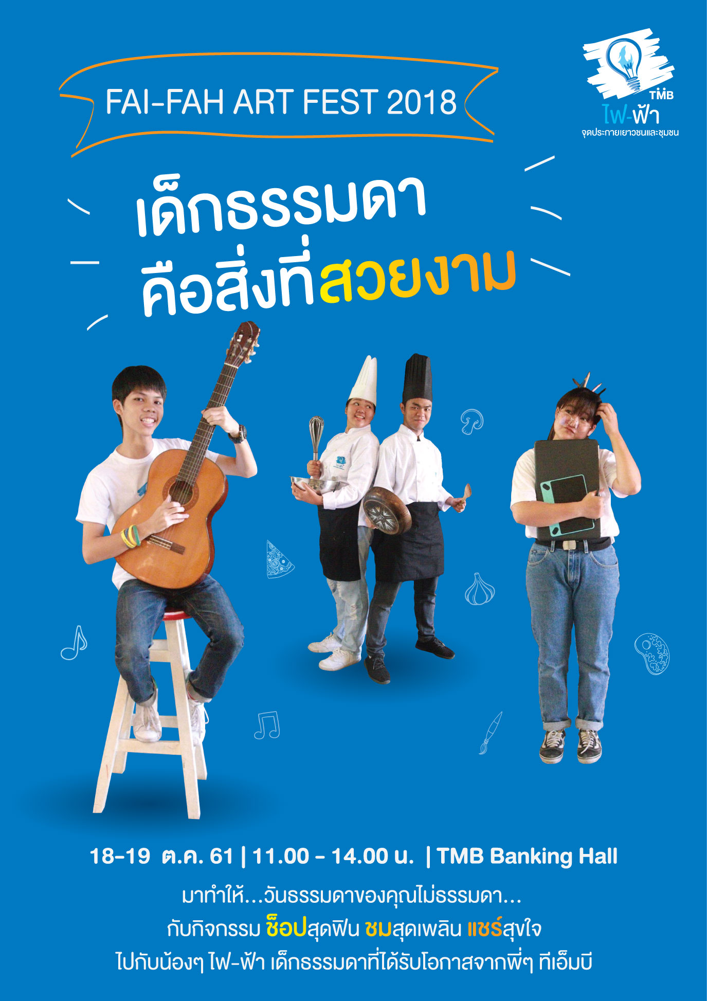 12 ตุลาคม 2561 : เที่ยวยุคนี้ พ.ศ.นี้ ต้องได้ครบอรรถรส ทั้งช็อป ชม แชร์ มีครบจบในงานเดียว และเป็นงานเดียวที่ดำเนินการทั้งหมดโดยเยาวชน นับตั้งแต่พิธีกร คนพาชมงาน คนจัดทำผลิตภัณฑ์และอาหาร คนจำหน่าย และคนแสดงดนตรี กีฬา ล้วนเป็นเยาวชนอายุระหว่าง 12-19 ปี เห็นแล้วจะต้องชื่นชม ต้องมาที่งาน “FAI-FAH ART FEST 2018 : เด็กธรรมดา คือสิ่งที่สวยงาม” ณ ทีเอ็มบี สำนักงานใหญ่ ถนนพหลโยธิน ช่วงวันที่ 18 -19 ตุลาคมนี้