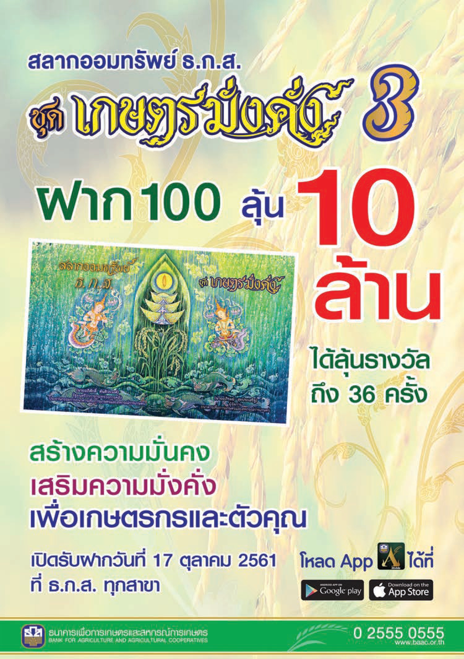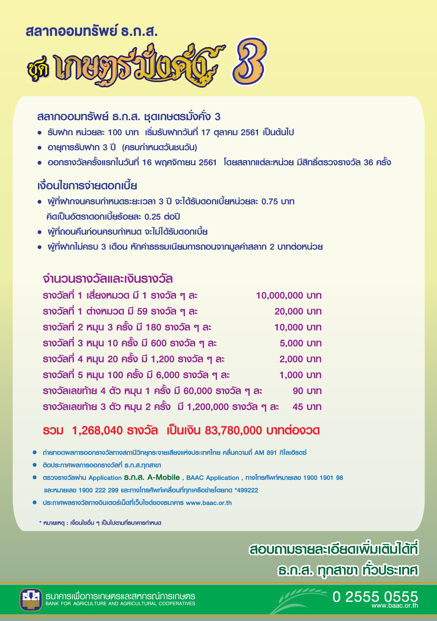 โดยท่านที่สนใจสามารถติดต่อสอบถามรายละเอียดเพิ่มเติมเกี่ยวกับสลากออมทรัพย์ ธ.ก.ส. ชุดเกษตรมั่งคั่ง 3 ได้ที่ http://www.baac.or.th หรือที่ ธ.ก.ส. ทุกสาขาทั่วประเทศ หรือที่ Call Center 02 555 0555 ![]()