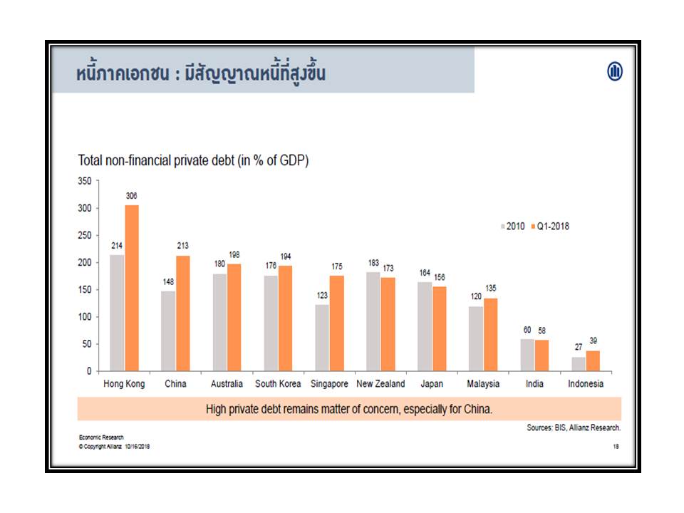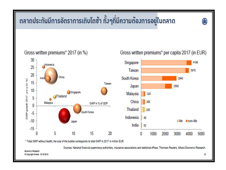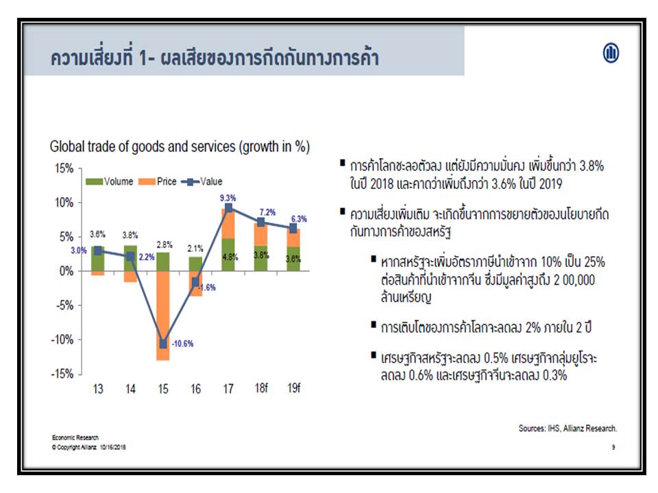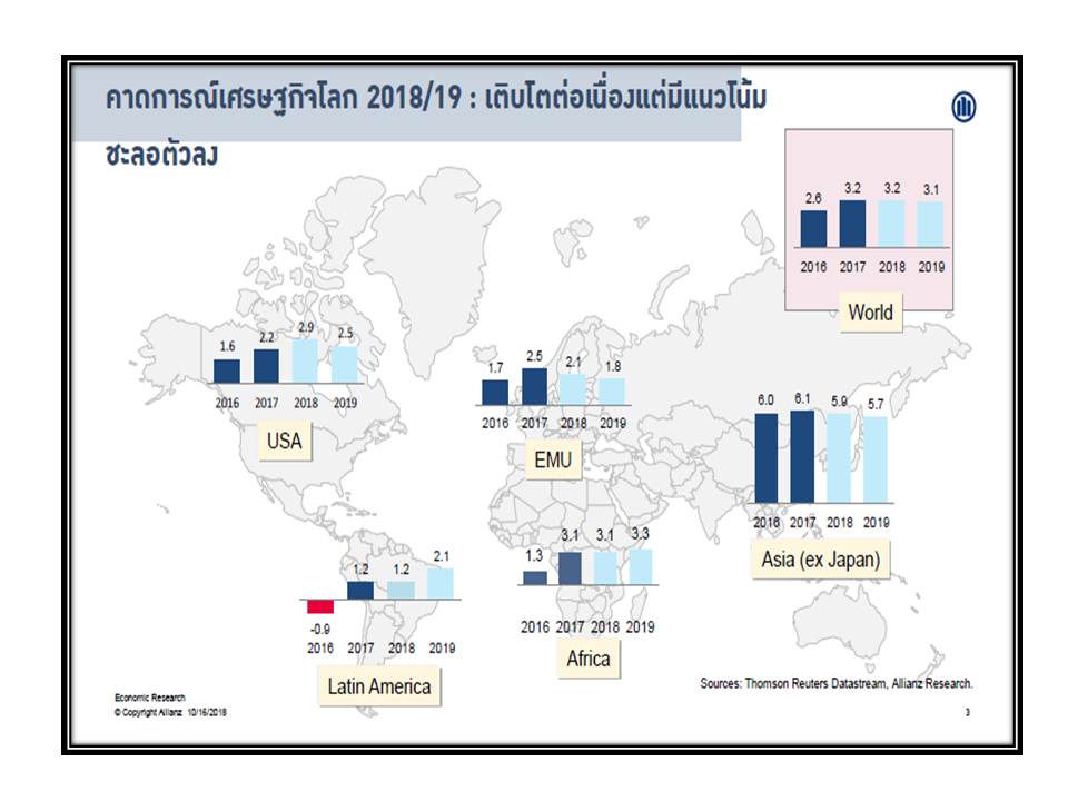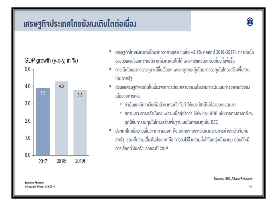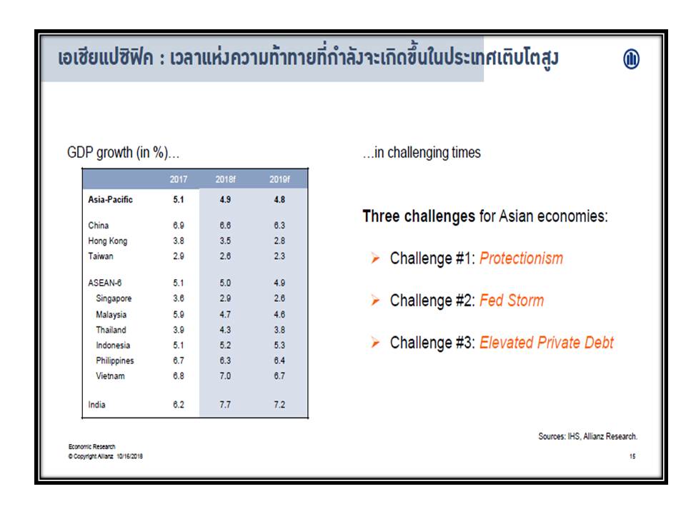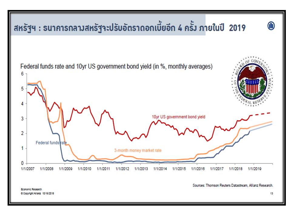 17 ตุลาคม 2561 : นายไมเคิล ไฮส์ หัวหน้านักเศรษฐศาสตร์ของกลุ่มอลิอันซ์ เยอรมนี ซึ่งเป็นผู้ถือหุ้นใหญ่ของ อลิอันซ์ อยุธยา ประกันชีวิต กล่าวว่า “ปีที่แล้วเป็นปีที่ดีมากสำหรับผู้ฝากเงิน ถือเป็นยุคหลังวิกฤติที่จบลงด้วยดี อย่างไรก็ตาม เมื่อเวลาผ่านไป นโยบายการเงินที่ครอบจักรวาลสุดขั้ว ช่วยให้เกิดกระแสขาขึ้นอย่างต่อเนื่องและมั่นคงในตลาดเงิน แต่ตอนนี้ก็เริ่มเห็นสัญญาณต่างๆ ที่น่าเป็นกังวล อาทิ การขึ้นอัตราดอกเบี้ย ความขัดแย้งทางการค้าและการเมืองที่เน้นนโยบายประชานิยมมากขึ้นเป็นสาเหตุให้เกิดความตึงเครียดและความวุ่นวาย ซึ่งทำให้เดือนแรกของปีนี้มีสัญญาณที่ไม่ดีนัก”
