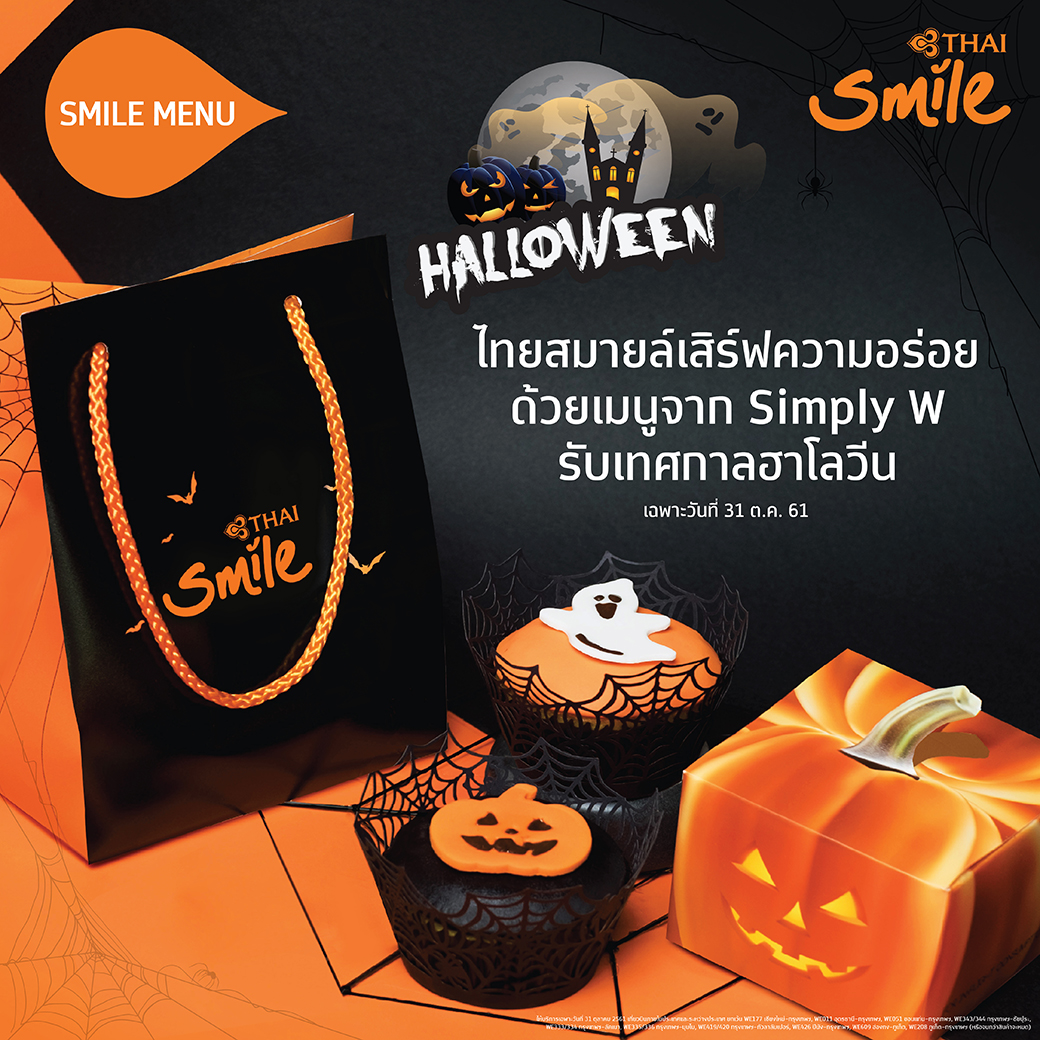 25 ตุลาคม 2561 : สายการบินไทยสมายล์ ขอมอบรอยยิ้มให้แก่ผู้โดยสารด้วยเมนูพิเศษต้อนรับเทศกาลฮาโลวีน “Casper Muffin” มัฟฟิ่น ลายผีน้อย Casper สอดไส้ไข่นกกระทาและไส้กรอกไก่ และ “Pumpkin Halloween Muffin” มัฟฟิ่น ลายฟักทอง สัญลักษณ์ Halloween สอดไส้ไข่นกกระทาและไส้กรอกไก่ จากร้าน Simply W ให้บริการเฉพาะวันที่ 31 ตุลาคม นี้ เท่านั้น