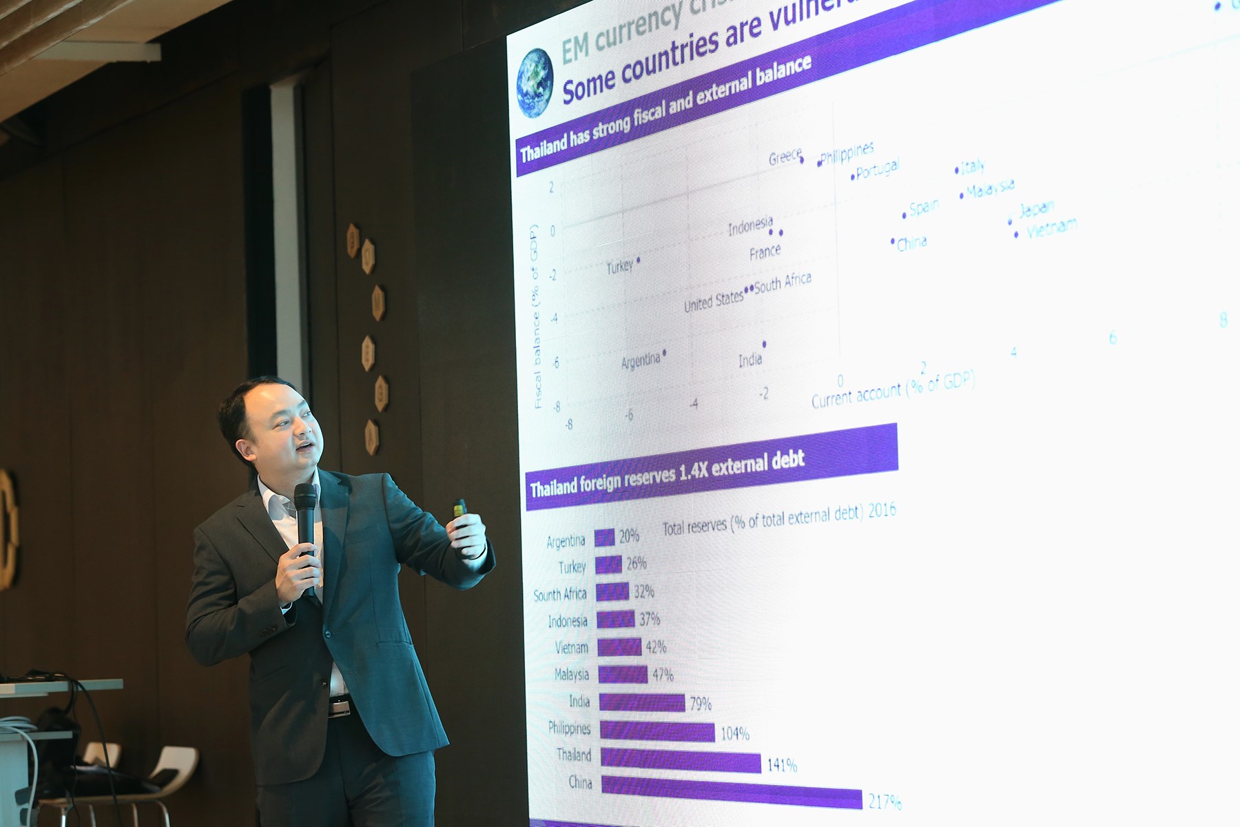 ส่วนเรื่องความเสี่ยงที่ต้องติดตามได้แก่ ปัญหาค่าเงินตลาดเกิดใหม่ซึ่งคาดว่าไม่น่าลุกลามเพราะเป็นปัจจัยเฉพาะตัวของบางประเทศซึ่งขาดวินัยและพึ่งพาเงินทุนไหลเข้าจากมาตรการผ่อนคลายเชิงปริมาณ (QE) มากเกินไปในช่วงก่อนหน้า ทำให้อาจเจอเศรษฐกิจหดตัวเมื่อสหรัฐฯ ปรับขึ้นดอกเบี้ย ส่วนไทยมีทุนสำรองเงินตราต่างประเทศจำนวนมาก หนี้ต่างประเทศน้อย เกินดุลบัญชีเดินสะพัดสูงมาก ฐานะการคลังแข็งแรง น่าจะผ่านพ้นความผันผวนภายนอกเหล่านี้ไปได้สบายๆ