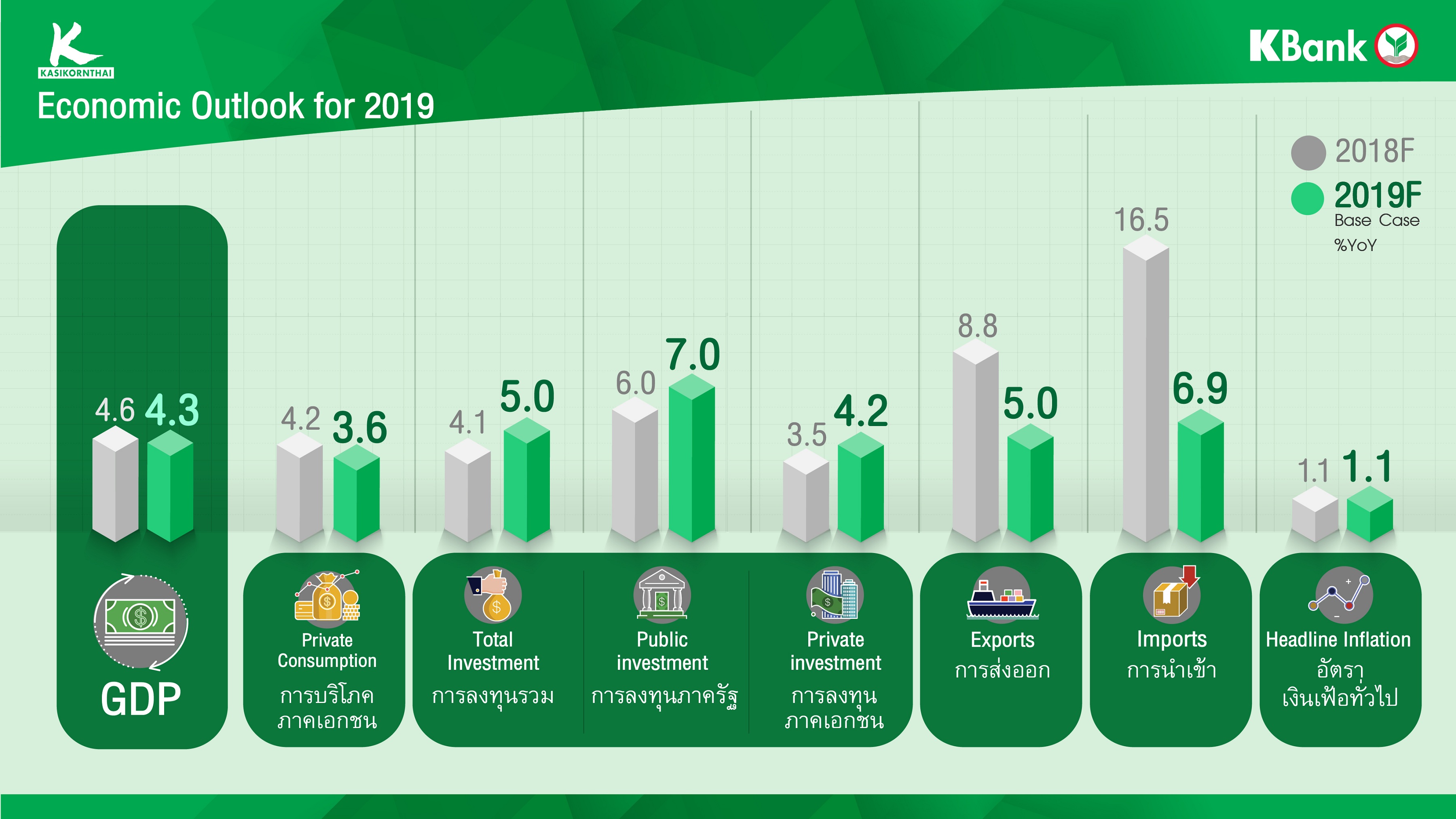 เนื่องจากการชะลอตัวของภาคการส่งออกและท่องเที่ยวจากปัจจัยฐานที่สูง ตลอดจนประเด็นเรื่องข้อพิพาททางการค้าระหว่างสหรัฐอเมริกาและจีนที่อาจจะส่งผลให้การค้าโดยรวมของโลกชะลอตัว ในขณะที่ตัวขับเคลื่อนเศรษฐกิจไทยที่สำคัญในปีหน้า จะมาจากการลงทุนโครงสร้างพื้นฐานอย่างต่อเนื่องของภาครัฐและความชัดเจนในเรื่องการเลือกตั้งทั่วไปที่น่าจะช่วยเสริมสร้างบรรยากาศการลงทุนในภาพรวมให้ดีขึ้น ด้านทิศทางดอกเบี้ยของไทยยังเป็นขาขึ้นท่ามกลางหนี้ครัวเรือนที่อยู่ในระดับสูง