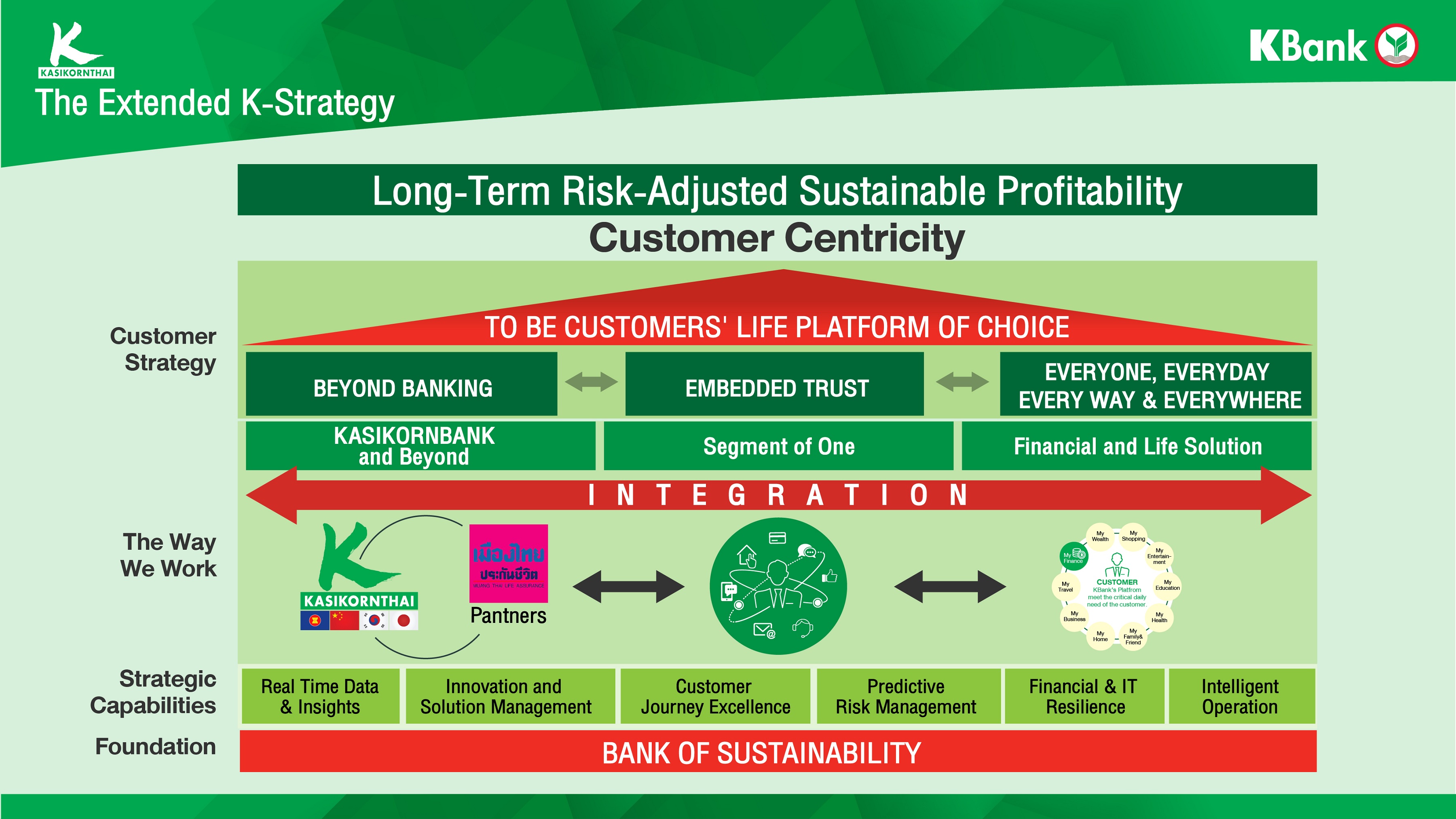 นำเสนอบริการทางการเงินและไลฟ์สไตล์ที่จะสามารถตอบสนองความต้องการของลูกค้าแบบรายบุคคล เดินหน้ายกระดับขีดความสามารถไปอีกขั้นทั้งด้านการเงินและเทคโนโลยีขององค์กรให้สามารถตอบสนองทุกสถานการณ์ พร้อมเป็นองค์การที่ใช้ข้อมูลเป็นพื้นฐานในการตัดสินใจและขับเคลื่อนธุรกิจ (Data-Driven Bank) บนรากฐานการเป็นธนาคารแห่งความยั่งยืนในทุกมิติ (Bank of Sustainability)