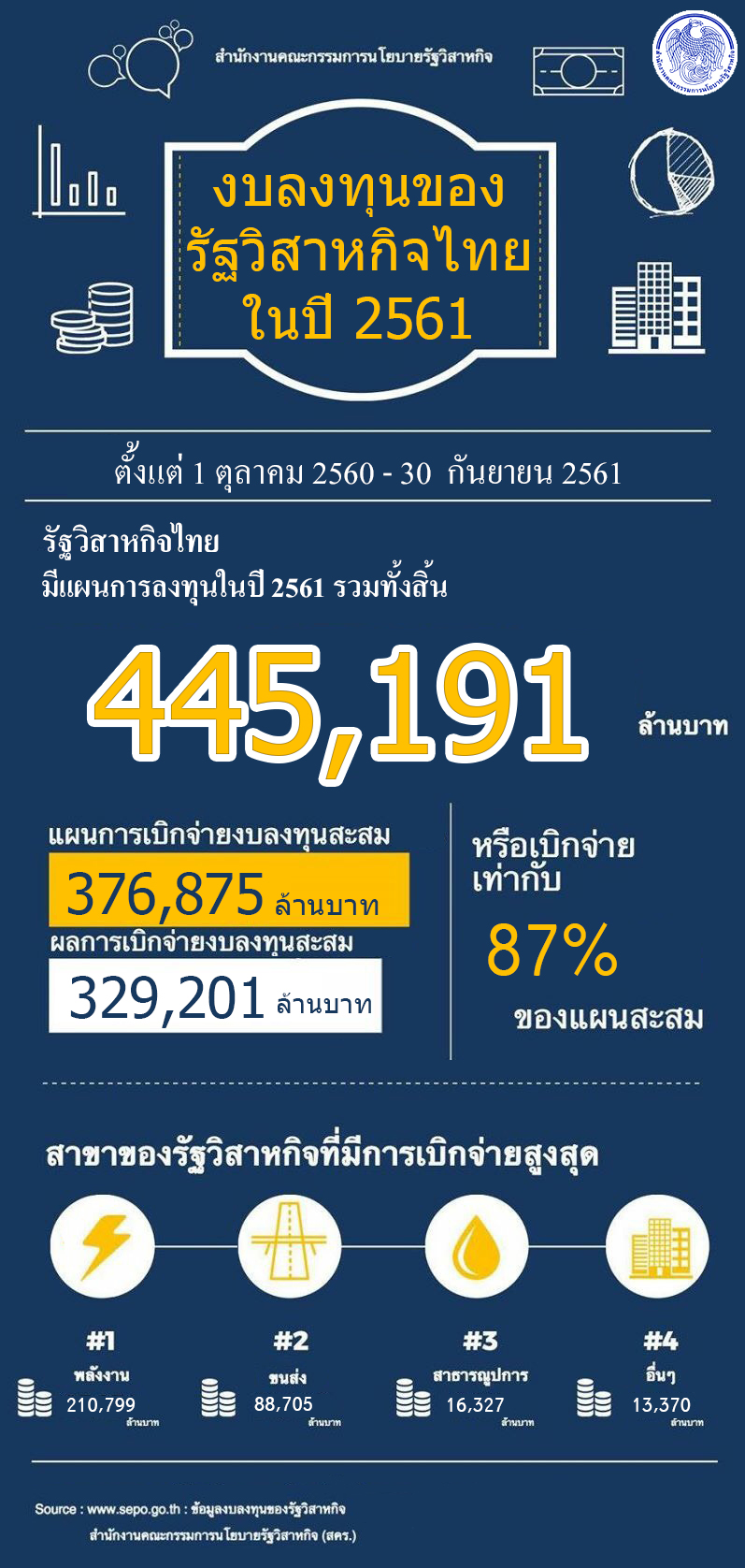 5 พฤศจิกายน 2561 : นายประภาศ คงเอียด ผู้อำนวยการสำนักงานคณะกรรมการนโยบายรัฐวิสาหกิจ (สคร.) เปิดเผยว่า ผลการเบิกจ่ายงบลงทุนสะสมของรัฐวิสาหกิจ 45 แห่ง ที่ สคร. กำกับดูแลโดยตรงตั้งแต่เดือนมกราคม 2561 – กันยายน 2561 มีจำนวน 310,926 ล้านบาท ซึ่งมีการขยายตัวสูงถึงร้อยละ 45 เมื่อเทียบกับผลเบิกจ่ายงบลงทุนสะสมในช่วงเวลาเดียวกันของปี 2560
