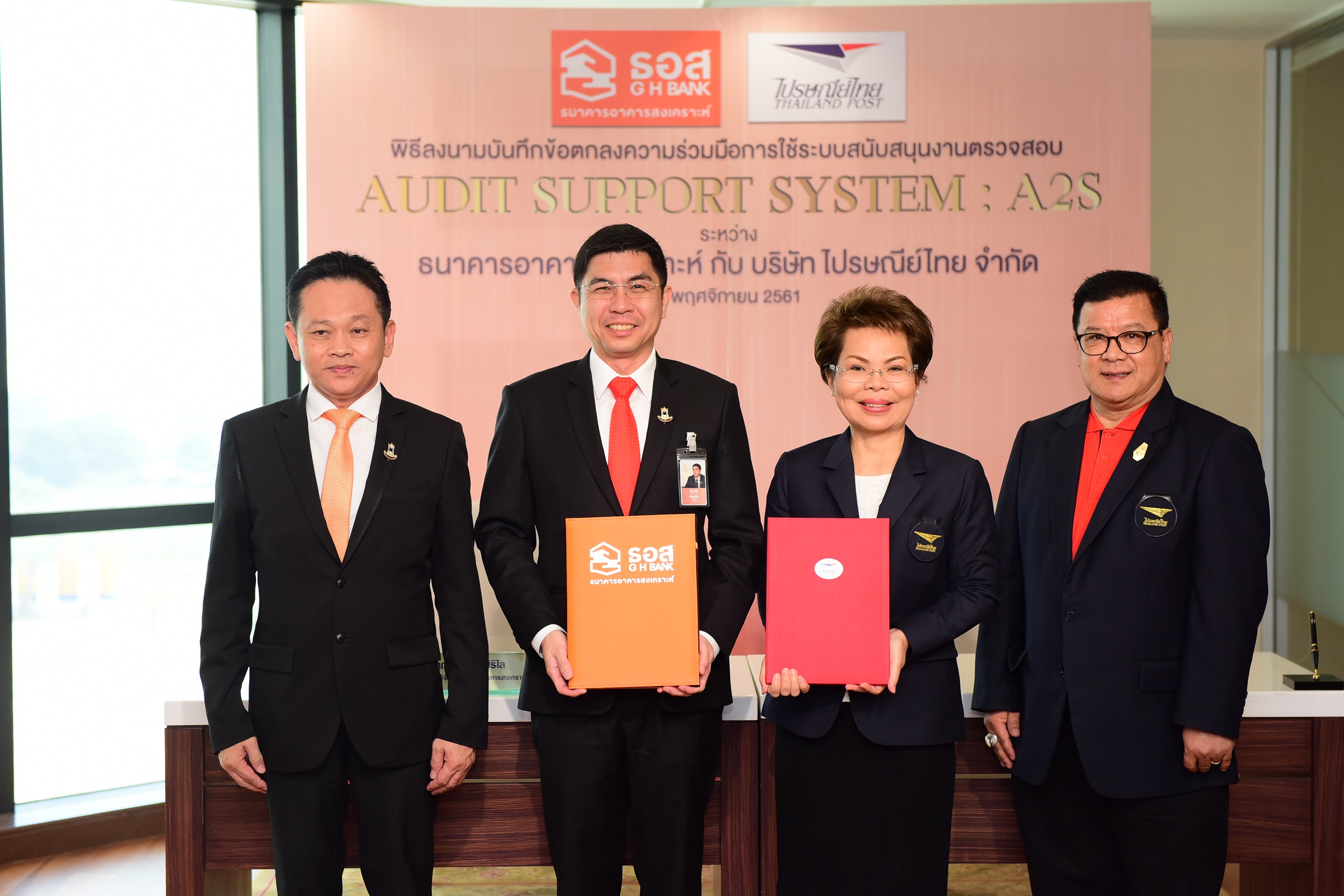 7 พฤศจิกายน 2561 : ฉัตรชัย ศิริไล กรรมการผู้จัดการ ธนาคารอาคารสงเคราะห์(ธอส.) และ สมร เทิดธรรมพิบูล กรรมการผู้จัดการใหญ่ บริษัท ไปรษณีย์ไทย จำกัด ร่วมลงนามบันทึกข้อตกลงความร่วมมือการใช้ระบบสนับสนุนงานตรวจสอบ (AUDIT SUPPORT SYSTEM : A2S)
