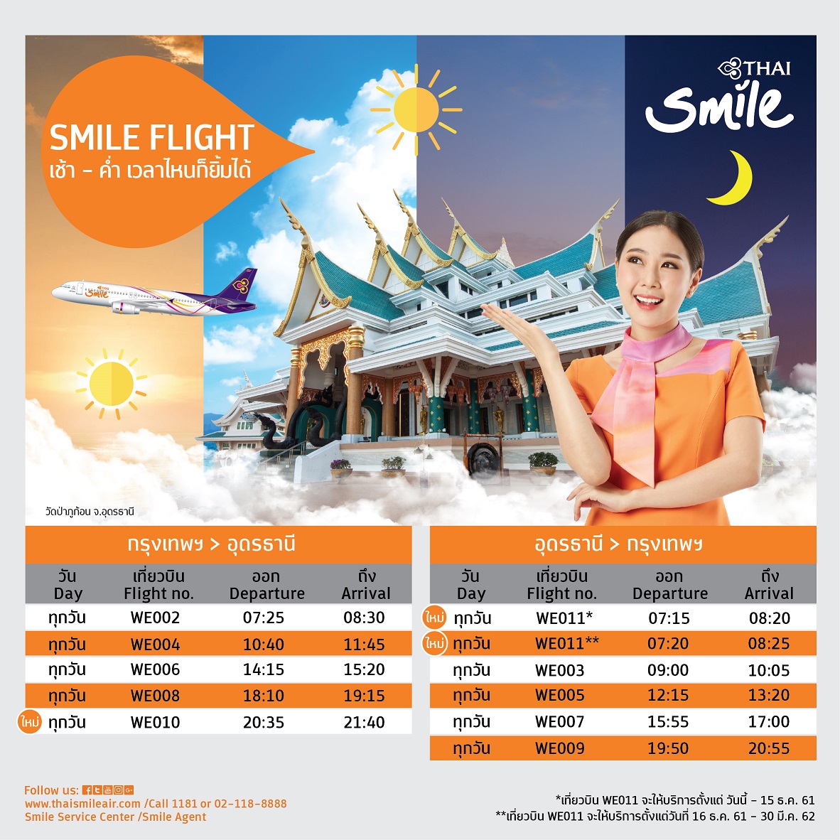 13 พฤศจิกายน 2561 : สายการบินไทยสมายล์เพิ่มความสะดวกสบายให้แก่ผู้โดยสารที่ต้องการเดินทางไปและกลับในเส้นทาง กรุงเทพ-อุดรธานี และกรุงเทพ-ขอนแก่น โดยเพิ่มเที่ยวบินในช่วงเช้าและค่ำเพิ่มเติม เพื่อเพิ่มทางเลือกให้แก่ผู้โดยสารบินสบายแบบฟูลเซอร์วิส