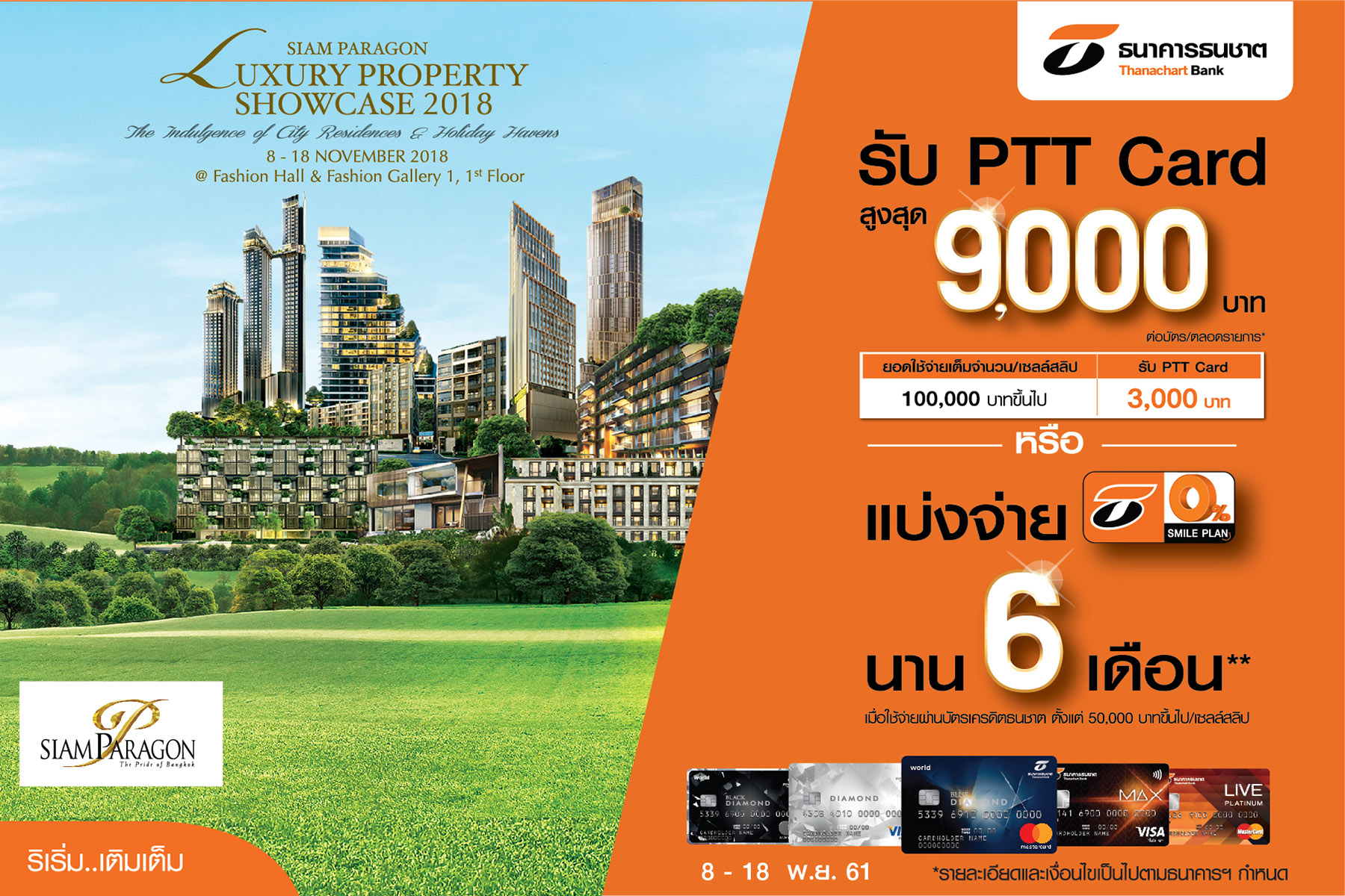 เมื่อลูกค้าใช้จ่ายผ่านบัตรเครดิตธนชาตภายในงาน 100,000 บาทขึ้นไป/เซลล์สลิป รับบัตร PTT Card มูลค่าสูงสุด 9,000 บาท หรือแบ่งจ่าย 0% นาน 6 เดือนเมื่อใช้จ่ายผ่านบัตรตั้งแต่ 50,000 บาทขึ้นไป/เซลล์สลิป รับสิทธิพิเศษได้ตั้งแต่วันนี้ถึงวันที่ 18 พ.ย. 2561 ณ แฟชั่นฮอลล์ และแฟชั่นแกลเลอรี่ 1 ชั้น 1 ศูนย์การค้าสยามพารากอน ![]()