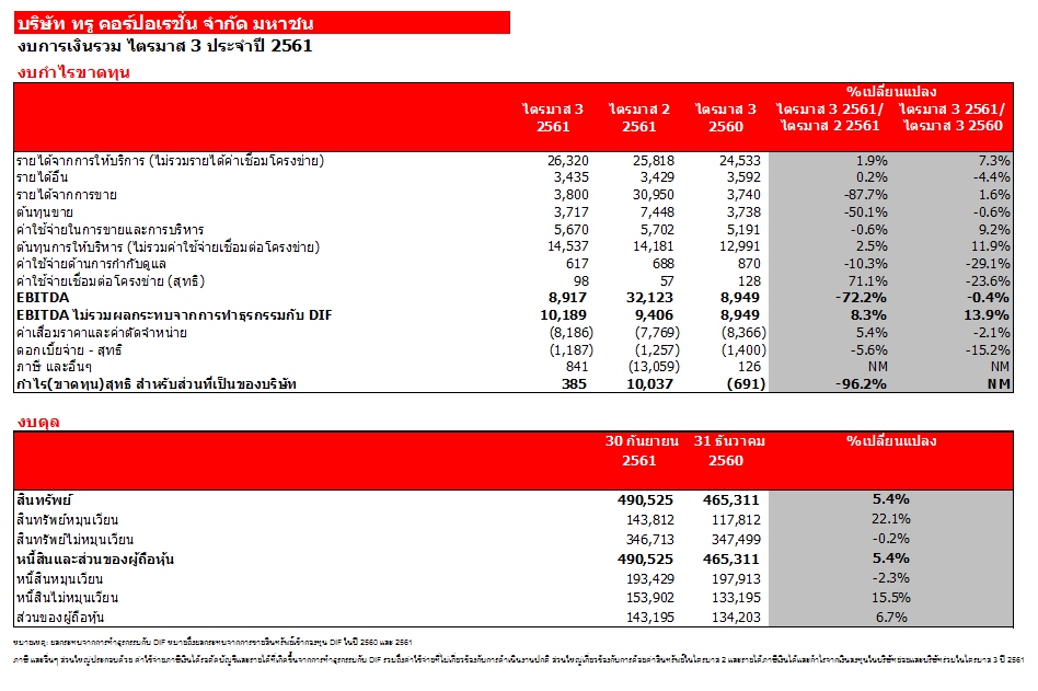 15 พฤศจิกายน 2561 : นายวิเชาวน์ รักพงษ์ไพโรจน์ กรรมการผู้จัดการใหญ่ (ร่วม) กล่าวว่า “กลุ่มทรู ยังคงรายงานผลกำไรสุทธิและ กำไรที่เพิ่มขึ้นจากการดำเนินงานในกลุ่มธุรกิจหลักได้อย่างต่อเนื่องในไตรมาส 3 ที่ผ่านมา อันเป็นผลจากรายได้จากการให้บริการที่เติบโตเข้มแข็ง ด้วยกลยุทธ์ที่มุ่งเน้นตอบสนองความต้องการของลูกค้าได้ตรงจุดและความทุ่มเทในการยกระดับคุณภาพโครงข่ายและมาตรฐานการให้บริการ ควบคู่ไปกับมาตรการบริหารต้นทุนที่เห็นผลชัดเจนและมีประสิทธิภาพมากยิ่งขึ้น