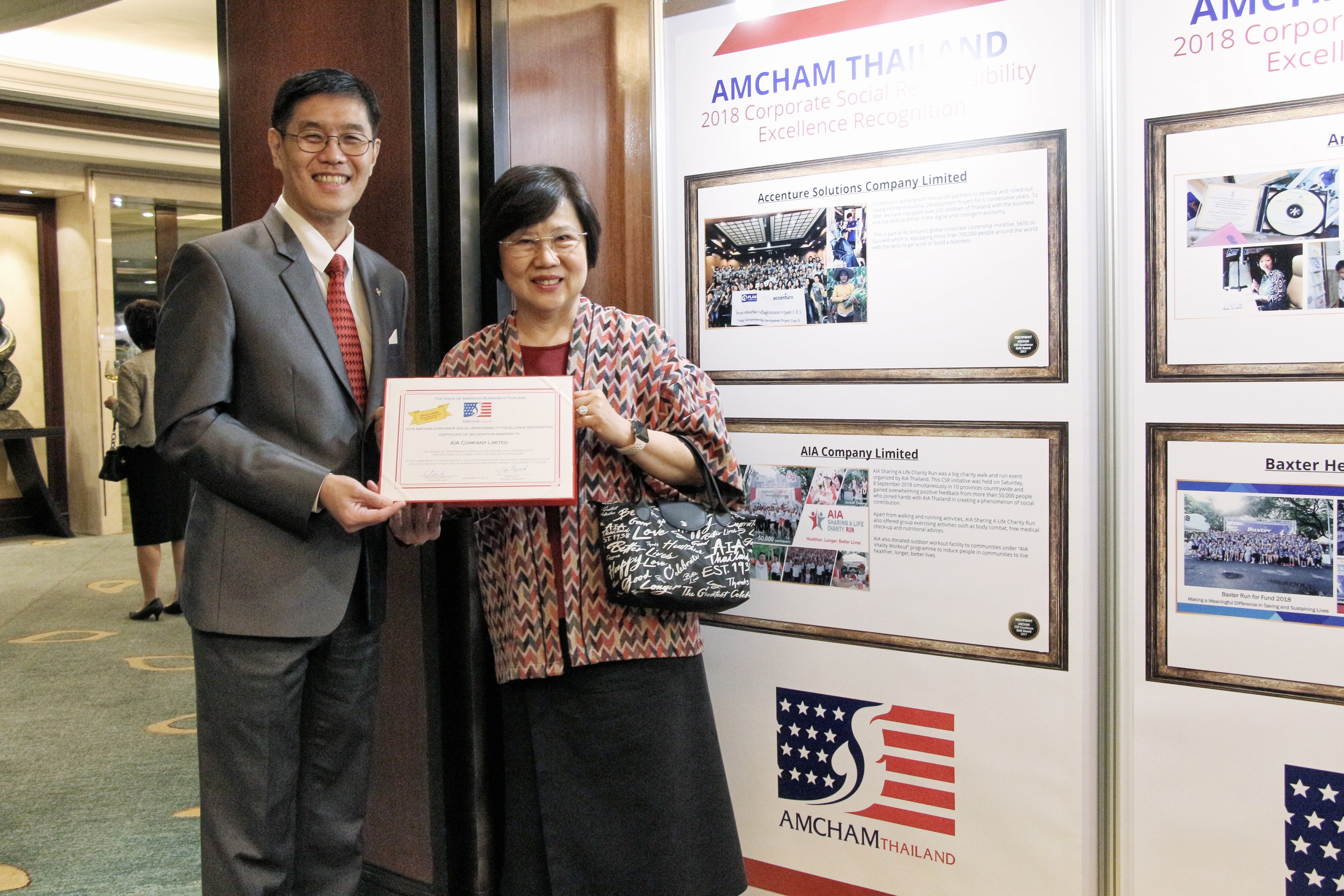 21 พฤศจิกายน 2561 : เอไอเอ ประเทศไทย โดย นายแพทย์ประมุกข์ ทรงจักรแก้ว (ที่ 5 จากซ้าย) ผู้อำนวยการฝ่ายการแพทย์ เป็นตัวแทน รับรางวัล “บริษัทที่มีความรับผิดชอบต่อสังคมดีเด่น ประจำปี 2561” หรือ “2018 AMCHAM CSR Excellence Recognition Award” ระดับ Gold จากสภาหอการค้าอเมริกันแห่งประเทศไทย (The American Chamber of Commerce in Thailand: AMCHAM) โดยมี ฯพณฯ มร. กลิน ที เดวีส์ เอกอัครราชทูตสหรัฐอเมริกาประจำประเทศไทย เป็นประธานมอบรางวัล