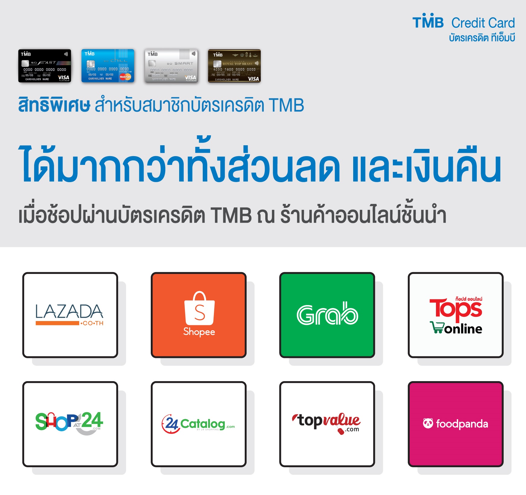 22 พฤศจิกายน 2561 : บัตรเครดิต TMB ชวนลูกค้าที่ชื่นชอบการช้อปออนไลน์ ได้ช้อปแบบคุ้มค่าเพราะทุกการช้อปคุณจะได้มากกว่าทั้งส่วนลดและเงินคืน เมื่อช้อปผ่านบัตรเครดิต TMB ณ ร้านค้าออนไลน์ชั้นนำที่ร่วมรายการ อาทิ Lazada Shopee Grab Tops Online ShopAt24 topvalue foodpanda Zilingo และ 24 Catalog ตั้งแต่วันนี้ยาวไปจนถึง 31 ธันวาคม 2561 โดยมอบสิทธิพิเศษให้มากกว่าถึง 3 ต่อ ได้แก่ ต่อที่ 1 รับส่วนลดเพิ่มเติมสูงสุด 12% ต่อที่ 2 รับเงินคืนสูงสุด 200 บาท/บัตร/ร้านค้า/เดือน