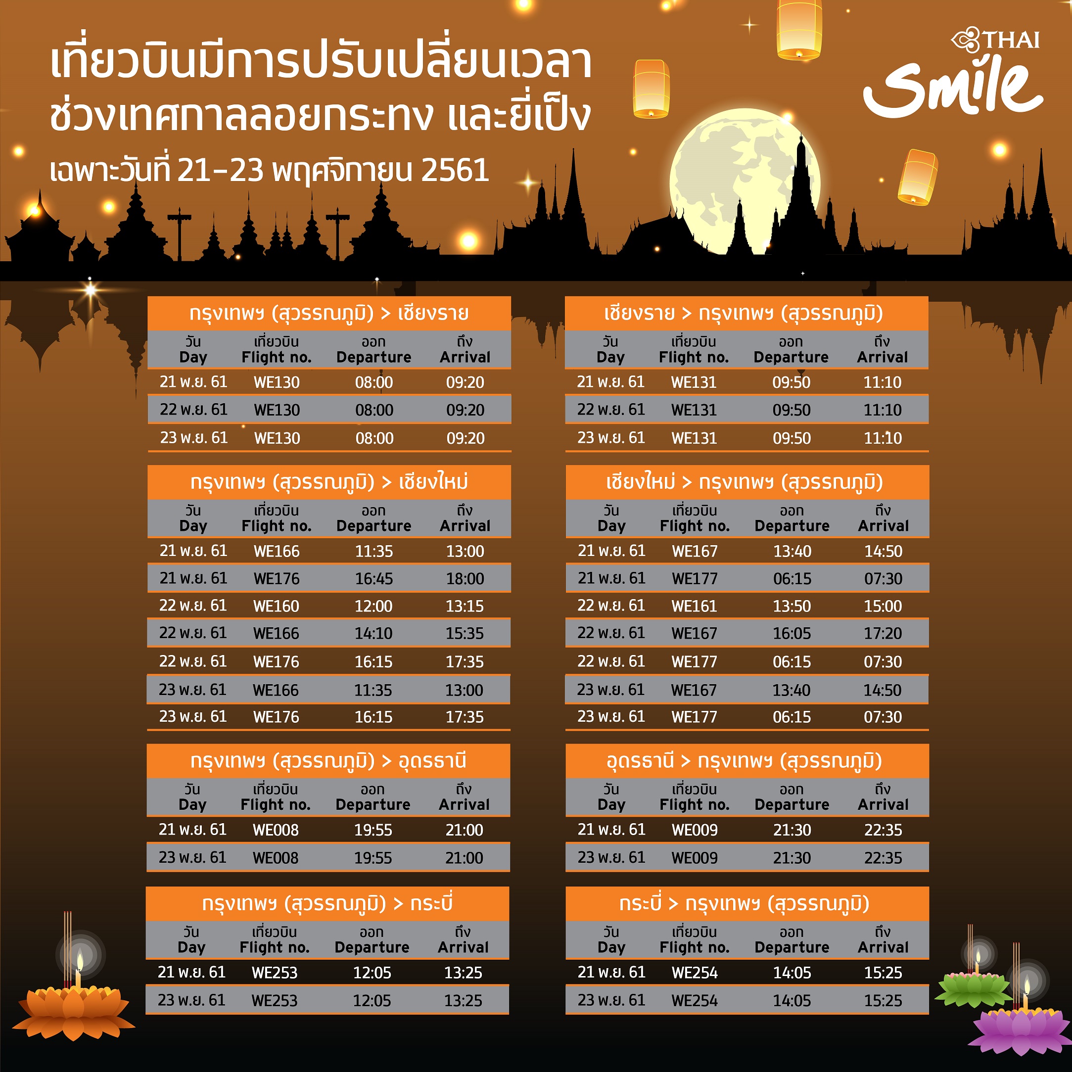 22 พฤศจิกายน 2561 : สายการบินไทยสมายล์ แจ้งปรับเปลี่ยนตารางบินในช่วงเทศกาลลอยกระทงและยี่เป็ง สำหรับเส้นทาง เชียงใหม่ เชียงราย กระบี่ และอุดรธานี ในระหว่างวันที่ 21-23 พฤศจิกายน 2561 เพื่อรักษามาตรฐานความปลอดภัยสูงสุดในการปฏิบัติการบิน
