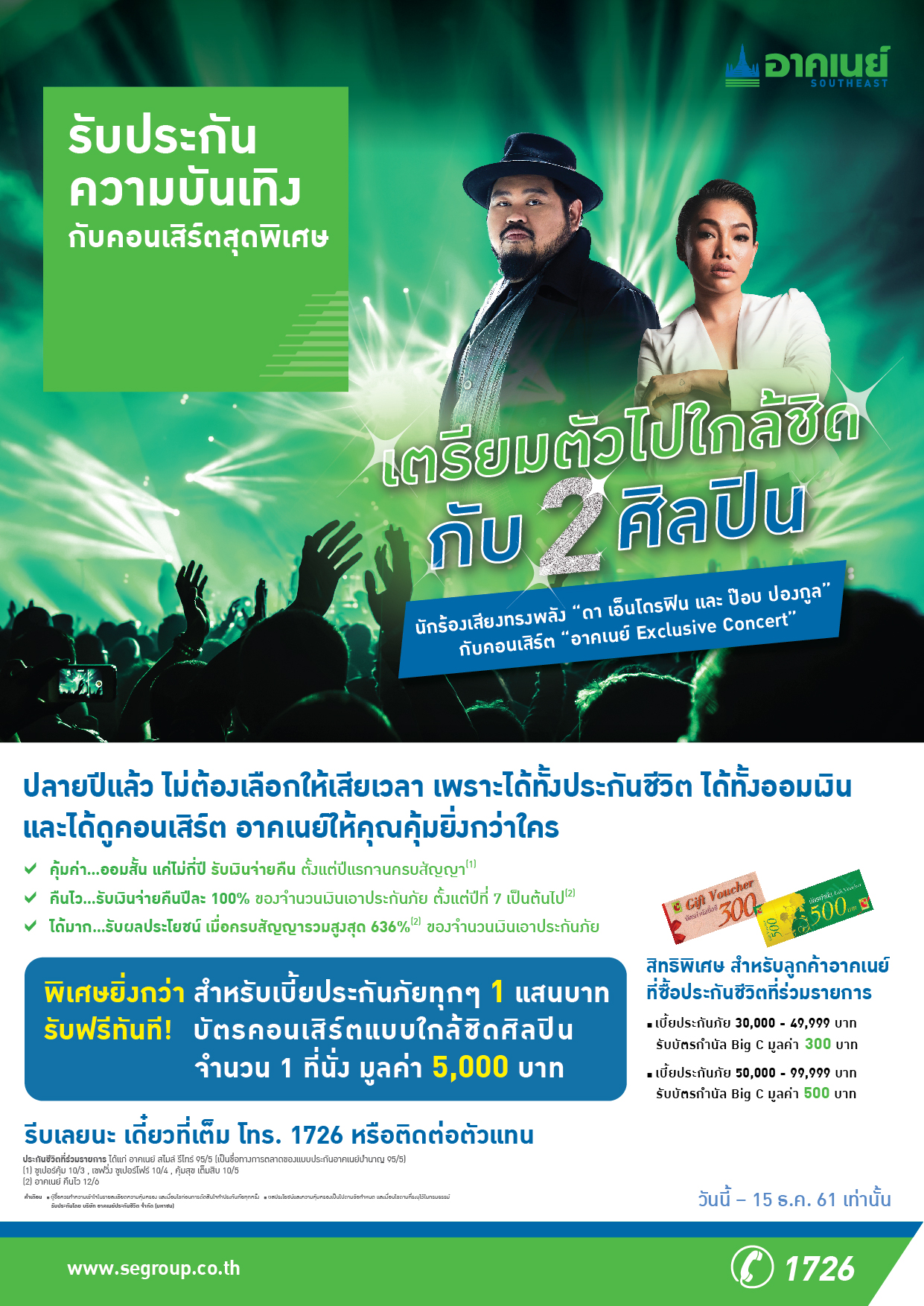 และเพื่อส่งมอบความสุขสุดพิเศษให้กับลูกค้าในช่วงปลายปี อาคเนย์ประกันชีวิตได้จัด “อาคเนย์ Exclusive Concert” คอนเสิร์ตสุดมันส์ โดย 2 ศิลปินนักร้องเสียงทรงพลัง “คุณดา เอ็นโดรฟิน” และ “คุณป๊อบ ปองกูล” โดยจัดแสดงในวันที่ 2 ก.พ. 2562 สำหรับลูกค้าที่สนใจผลิตภัณฑ์ประกันชีวิต สามารถติดต่อตัวแทน หรือ ผ่านช่องทางออนไลน์ www.selic-taxsaving.com หรือสอบถามรายละเอียดเพิ่มเติม โทร. 1726”