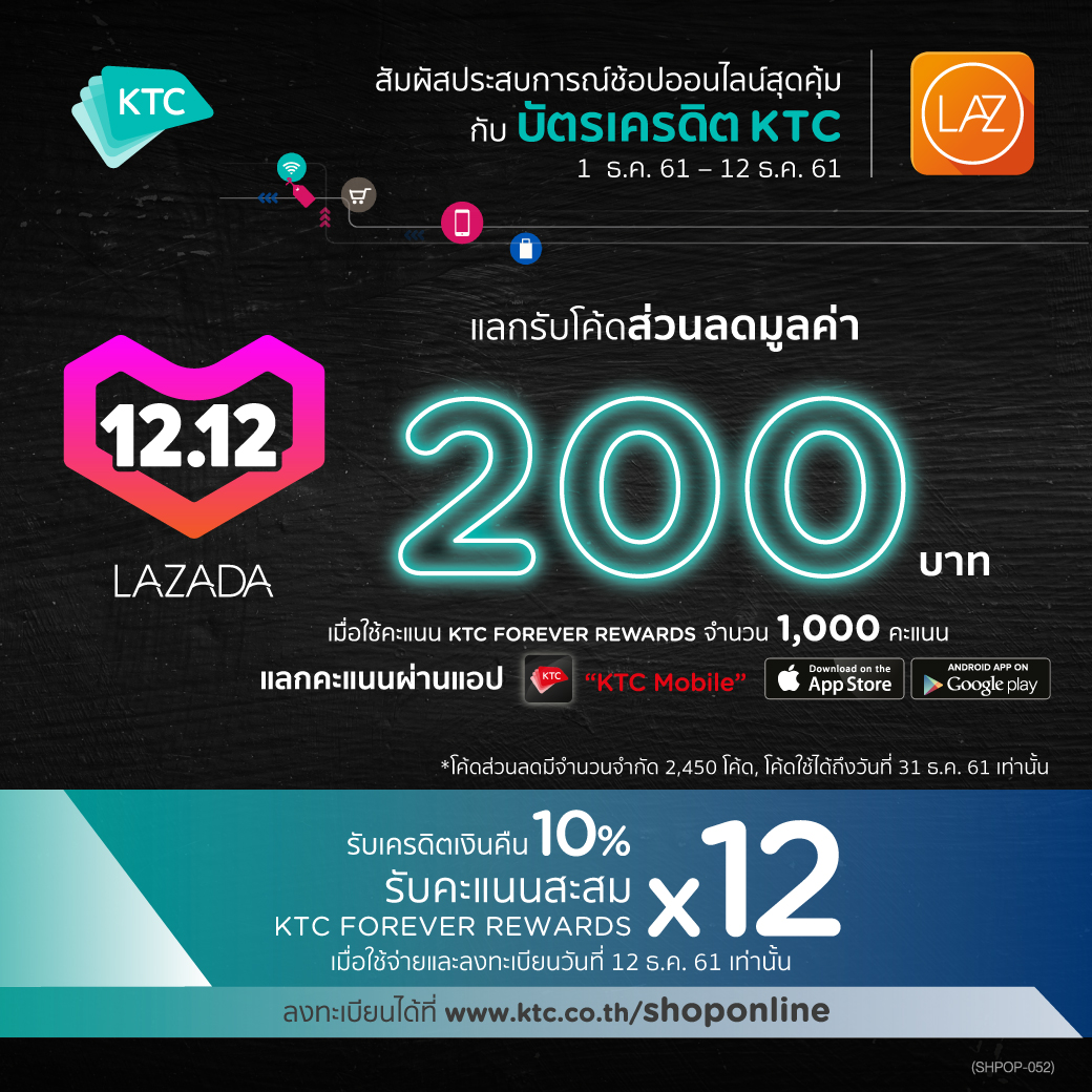 และสามารถนำรหัสส่วนลดดังกล่าวไปใช้ซื้อสินค้าได้ที่โมบายแอปพลิเคชัน “LAZADA” หรือ www.lazada.co.th จนถึงวันที่ 31 ธันวาคม 2561 เท่านั้น พิเศษสำหรับวันที่ 12 ธันวาคม 2561 สมาชิกเคทีซีจะได้รับโค้ดส่วนลดพิเศษเมื่อช้อปกับลาซาด้าและลงทะเบียนผ่าน www.ktc.co.th/shoponline พร้อมรับเครดิตเงินคืน 10% และคะแนนสะสมฯ 12 เท่า (คะแนนสะสมปกติ 1 เท่า และคะแนนสะสมพิเศษ 11 เท่า) เมื่อใช้คะแนน KTC FOREVER เท่ายอดซื้อต่อรายการในการแลกรับ ![]()