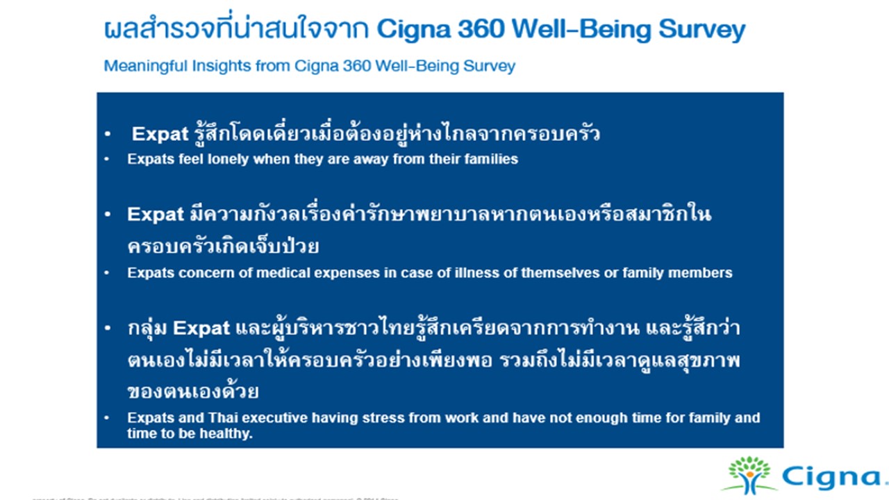 ทางด้าน นายธีรวุฒิ สุธนะเสรีพร รองประธานอาวุโสผ่ายการตลาด บริษัท ซิกน่า ประกันภัย จำกัด (มหาชน) กล่าวว่า ซิกน่าศึกษาพฤติกรรมความต้องการด้านสุขภาพของกลุ่ม Expat รวมถึงพฤติกรรมของผู้บริโภคในยุคดิจิตอล