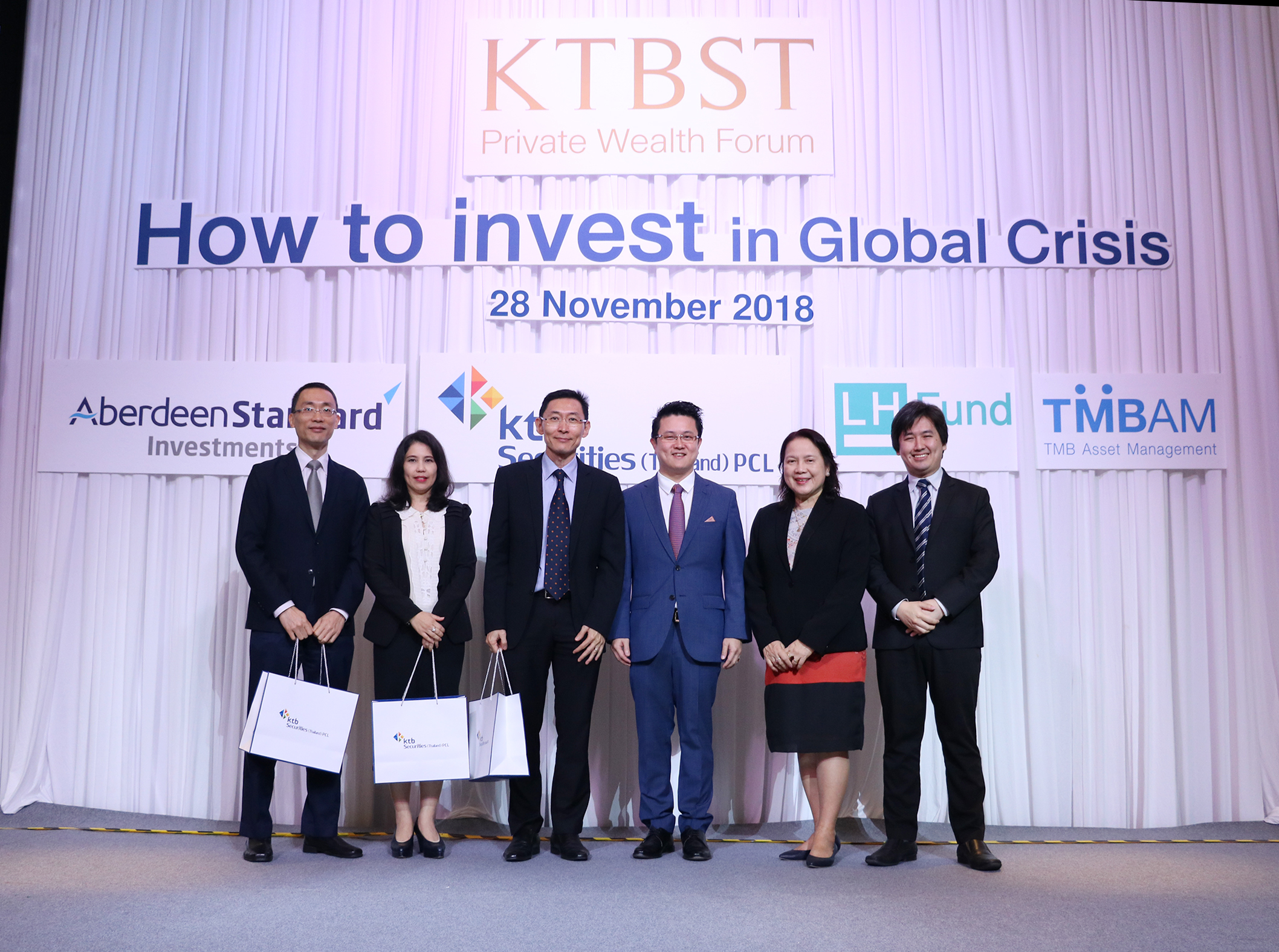 29 พฤศจิกายน 2561 : บริษัทหลักทรัพย์ เคทีบี (ประเทศไทย) จำกัด (มหาชน) หรือ KTBST จัดงาน KTBST Private Wealth Forum : How to invest In Global Crisis นำเสนอมุมมองเศรษฐกิจโลกและเศรษฐไทยในปี 2019 จากผู้จัดกองทุนโดยมี ออเสน การบริสุทธิ์ Head of Equities Thailand บลจ. อเบอร์ดีน สแตนดาร์ด (ประเทศไทย) จำกัด , นรี พฤกษยาภัย ผู้ช่วยกรรมการผู้จัดการ บลจ. แลนด์ แอนด์ เฮ้าส์ จำกัด และ ไพศาล ครุฑดำรงชัย รองกรรมการผู้จัดการฝ่ายที่ปรึกษาการลงทุน บลจ. ทหารไทย จำกัด มาให้มุมมองและคำแนะนำการลงทุนในตลาดหุ้นไทย, อสังหาริมทรัพย์ และตลาดหุ้นญี่ปุ่นแก่ลูกค้า Private Wealth ของ KTBST