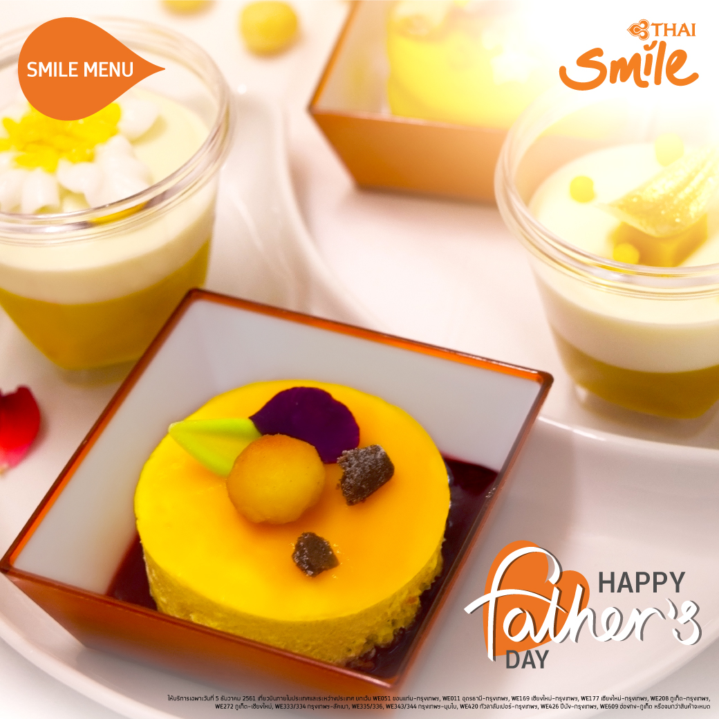 3 ธันวาคม 2561 : สายการบินไทยสมายล์ ขอร่วมฉลองวันพ่อแห่งชาติ อีกหนึ่งวันสำคัญของคนไทย และร่วมเป็นส่วนหนึ่งในการแสดงออกถึงความรักที่มีต่อคุณพ่อ โดยรังสรรค์เมนูพิเศษ พร้อมให้บริการแก่ผู้โดยสารในทุกที่นั่งทุกเที่ยวบิน ในวันที่ 5 ธันวาคม 2561 นี้ เที่ยวบินภายในประเทศ เสิร์ฟเมนูพิเศษ พานาคอตต้ามะม่วง (Mango Panacotta) และตะโก้ฟักทอง (Pumpkin Coconut Pudding)