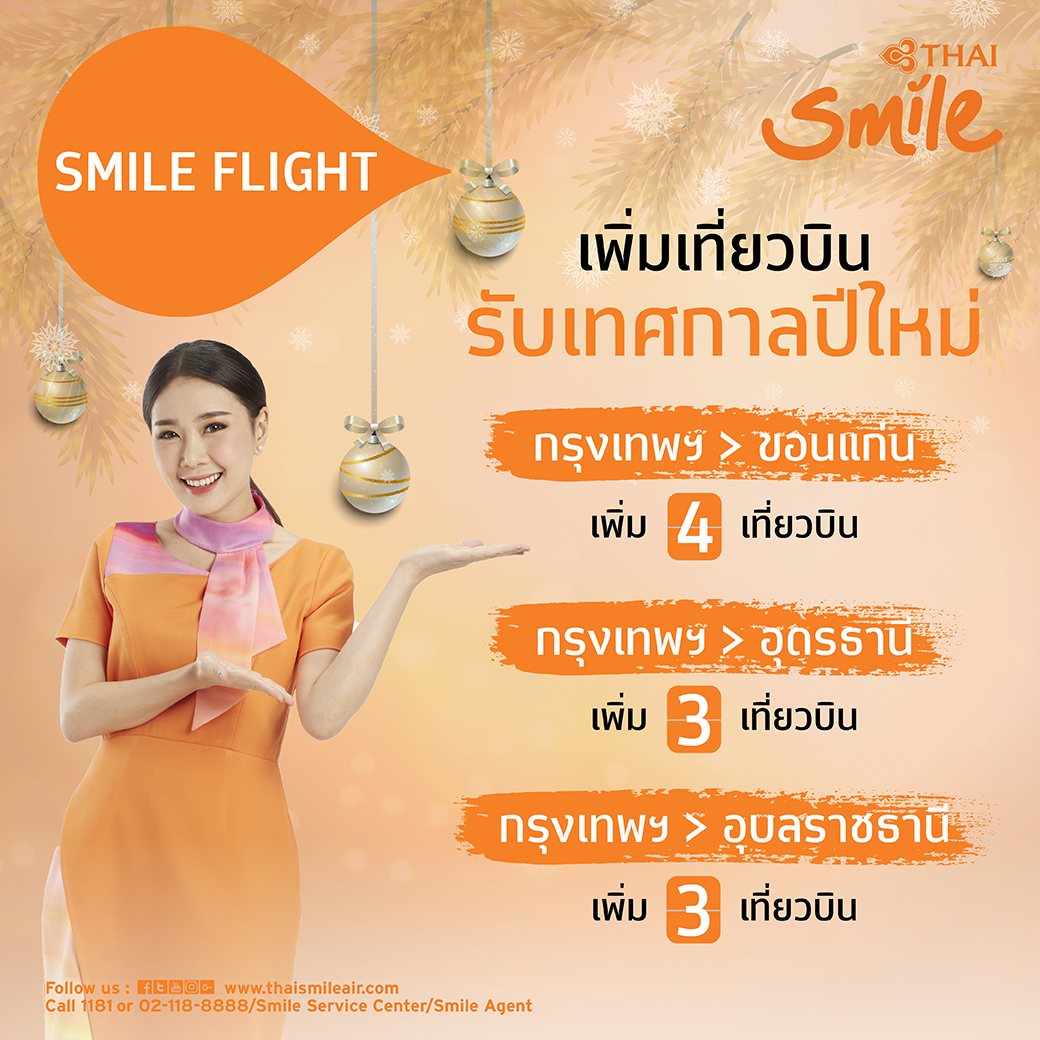 11 ธันวาคม 2561 : สายการบินไทยสมายล์ เพิ่มความสะดวกสบายให้แก่ผู้โดยสารที่ต้องการเดินทางในช่วงเทศกาลปีใหม่ โดยเพิ่มเที่ยวบินไปและกลับในเส้นทาง กรุงเทพฯ-ขอนแก่น กรุงเทพ-อุดรธานี และกรุงเทพ-อุบลราชธานี รวม 10 เที่ยวบิน ในระหว่างวันที่ 27 ธันวาคม 2561 – 2 มกราคม 2561 ผู้โดยสารสามารถเลือกเที่ยวบินที่มาพร้อมบริการแบบฟูลเซอร์วิสได้ตลอดทั้งวัน