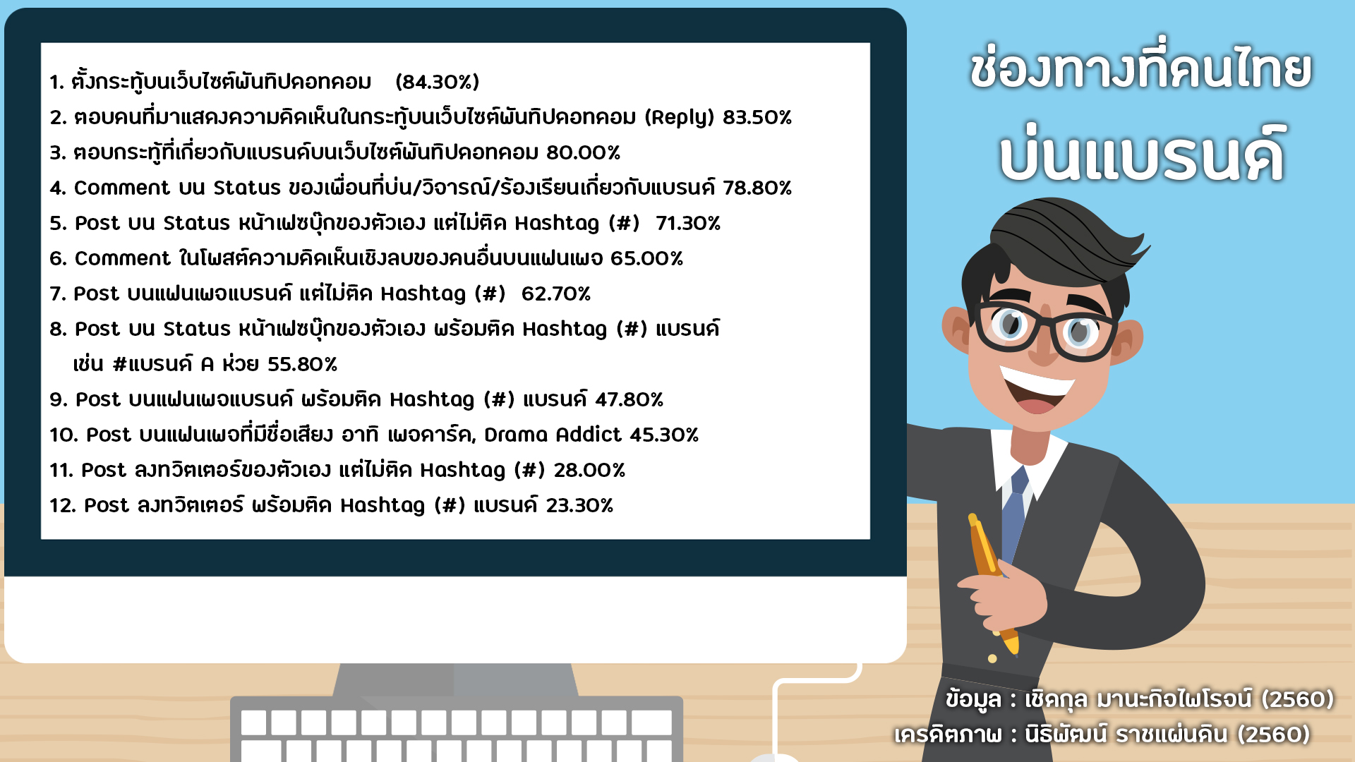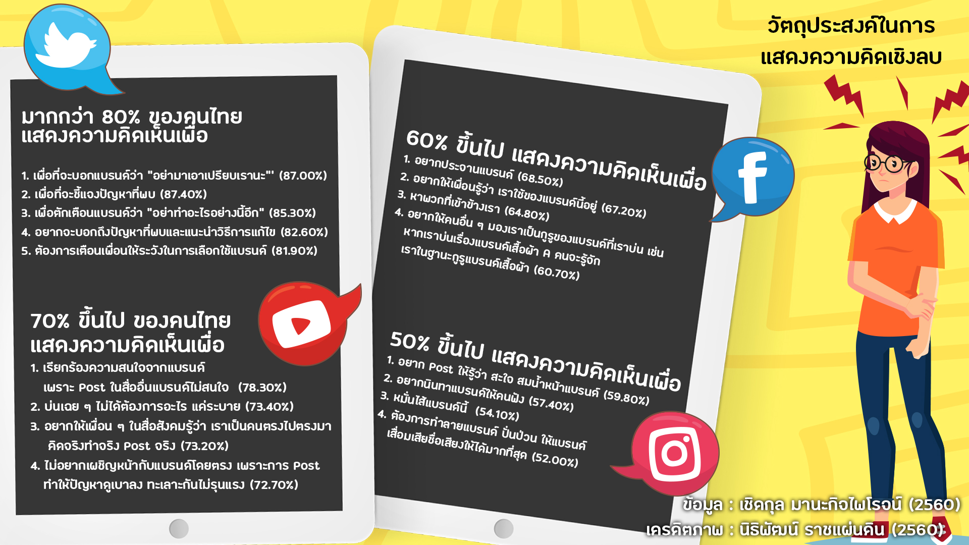 ผลการศึกษาพบว่า มากกว่า 50% ของคนไทยแสดงความคิดเห็นเชิงลบบน Social Media เพื่อ 1) สื่อสารกับแบรนด์โดยตรง ไม่ว่าจะเป็นการพูดกับแบรนด์ ตักเตือนแบรนด์ ชี้แจงปัญหาที่พบ หรือแนะนำการแก้ไขปัญหากับแบรนด์ 2) ตักเตือนเพื่อนหรือคนใกล้ตัวให้ระวังในการเลือกแบรนด์ 3) เรียกร้องความสนใจจากแบรนด์ 4) ระบายความรู้สึก 5) ลดการเผชิญหน้ากับแบรนด์โดยตรง 6) ประจานแบรนด์ 7) หาพวกที่เข้าข้าง 8) แสดงตนว่าตัวเองเป็นกูรูในด้านนั้นๆ 9) บอกเพื่อนว่าตนเองเป็นคนจริง และ 10) ตอบโต้และแก้แค้นแบรนด์