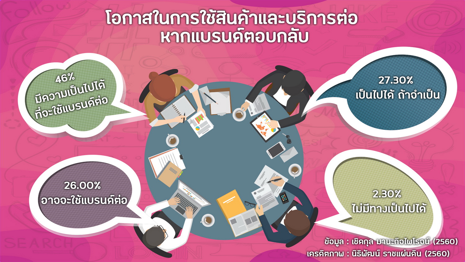 ผลการศึกษาพบว่า หากกลุ่มตัวอย่างได้รับการตอบกลับจากแบรนด์ และแบรนด์ดำเนินการแก้ปัญหา ในภาพรวมคนไทยส่วนใหญ่ยังคงใช้สินค้าและบริการต่อ (Mean = 3.27, S.D.= 1.07) โดย 46% มีความเป็นไปได้ที่จะใช้แบรนด์ต่อ 26.00% อาจจะใช้แบรนด์ต่อ 27.30% เป็นไปได้ ถ้าจำเป็น และ 2.30% ไม่มีทางเป็นไปได้