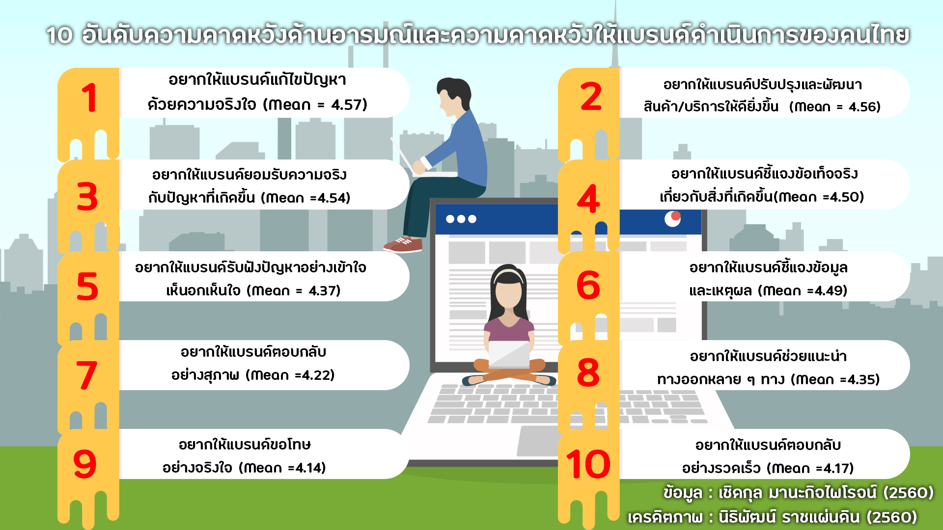 ผลการศึกษาพบว่า คนไทยต้องการให้แบรนด์รับฟังปัญหาอย่างเข้าใจ ยอมรับความจริง ชี้แจงข้อมูล แนะนำทางออกและตอบกลับสุภาพในระดับมากที่สุด รองลงมาคือ ต้องการให้แบรนด์ตอบอย่างรวดเร็ว ห้ามลบความคิดเห็น หาผู้รับผิดชอบ และ inbox ส่วนตัวเพื่อแก้ปัญหา ในระดับมาก ในขณะที่ การ Inbox ไปขอเบอร์โทรศัพท์เพื่อติดต่อโดยตรง การนำบุคคลที่น่าเชื่อถือ อาทิ ผู้นำทางความคิด นักวิชาการ ผู้เชี่ยวชาญ บุคคลที่มีชื่อเสียง มาชี้แจงถึงปัญหาที่เกิดขึ้นผ่านสื่อต่าง ๆ การที่ผู้บริหารบริษัทออกมาเจรจาด้วยตนเอง การขอโทษผ่านสื่อมวลชนและสื่อสังคม และการมอบสิทธิพิเศษ ของแถม โปรโมชั่น เป็นสิ่งที่คนไทยคาดหวังจะได้ในระดับปานกลาง