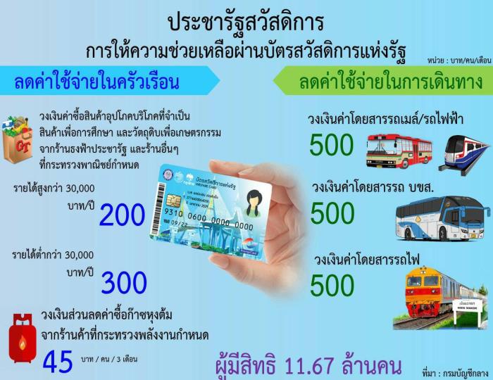 – วงเงินค่าโดยสารรถไฟ จะได้รับ 500 บาท/คน/เดือน โดยการใช้สิทธิจากจุดจำหน่ายบัตรโดยสารรถไฟทุกสถานี (รฟท.)