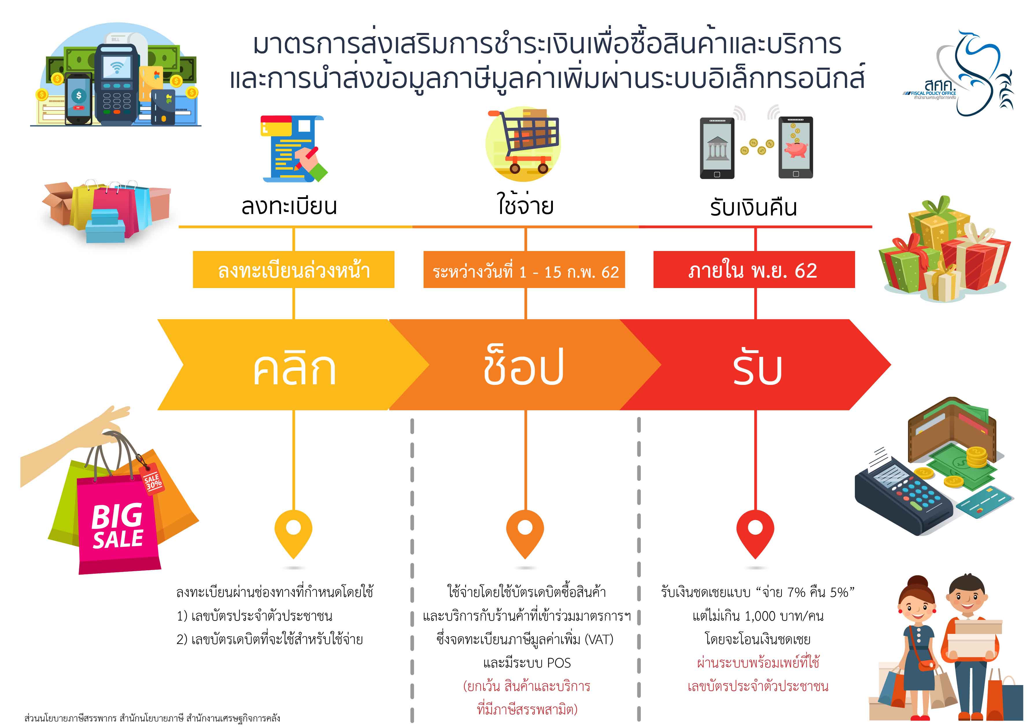 19 ธันวาคม 2561 : นายลวรณ แสงสนิท ผู้อำนวยการสำนักงานเศรษฐกิจการคลัง ในฐานะโฆษกกระทรวงการคลัง เปิดเผยว่า คณะรัฐมนตรีได้มีมติเมื่อวันที่ 18 ธันวาคม 2561 เห็นชอบมาตรการส่งเสริมการชำระเงินเพื่อซื้อสินค้าและบริการ และการนำส่งข้อมูลภาษีมูลค่าเพิ่มผ่านระบบอิเล็กทรอนิกส์ (มาตรการฯ) ตามที่กระทรวงการคลังเสนอ โดยมีสาระสำคัญสรุปได้ ดังนี้