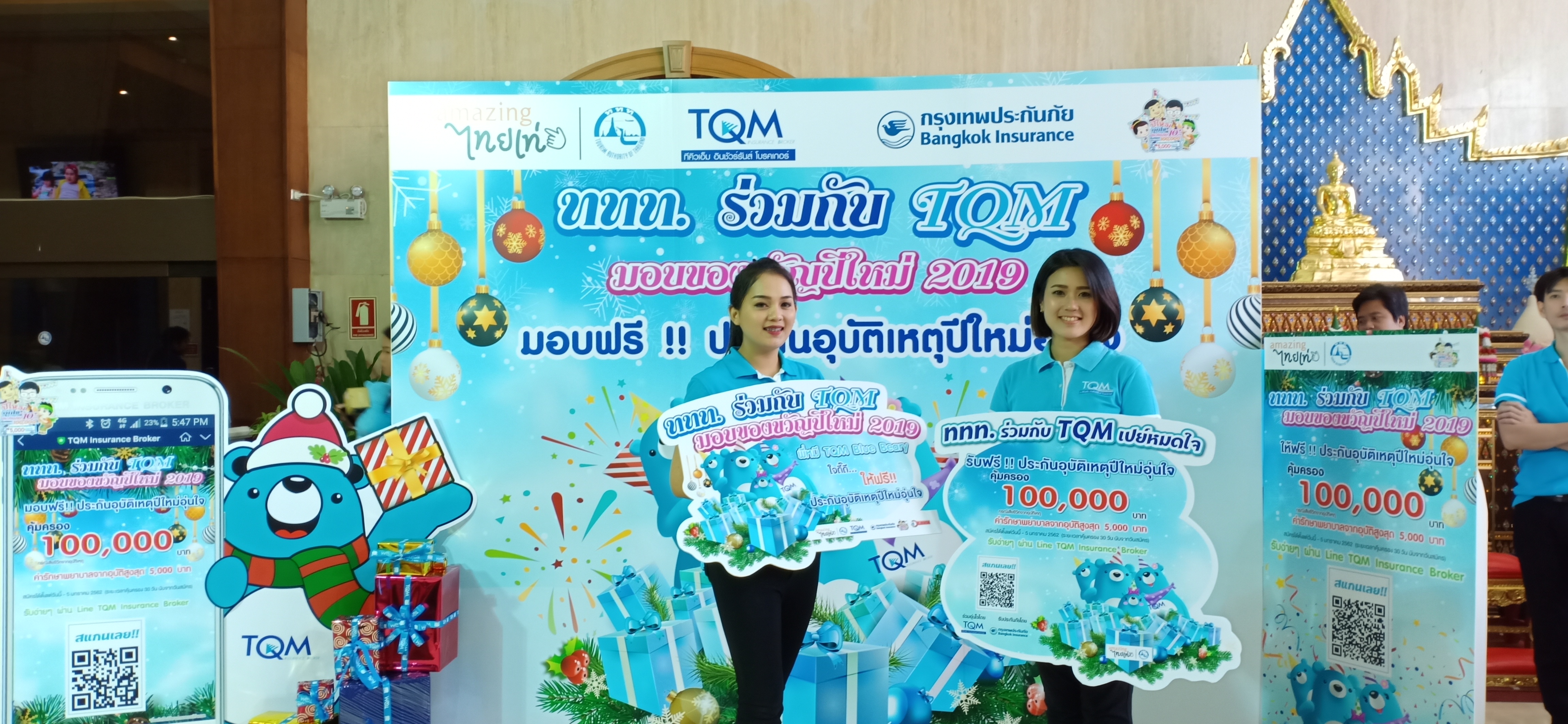 ซึ่งนอกเหนือจากกิจกรรมดังกล่าวแล้ว ททท. ยังได้ร่วมมือกับ บริษัท ทีคิวเอ็ม อินชัวร์รันส์ โบรคเกอร์ จำกัด มอบ “ประกันอุบัติเหตุปีใหม่อุ่นใจ”แก่นักท่องเที่ยวชาวไทยจำนวน 100,000 คนแรก ที่สมัครรับสิทธิ์ประกันอุบัติเหตุผ่านแอปพลิเคชัน Line เมื่อเข้าเป็นเพื่อน (Add Friend) TQM INSURANCE BROKER OFFICIAL