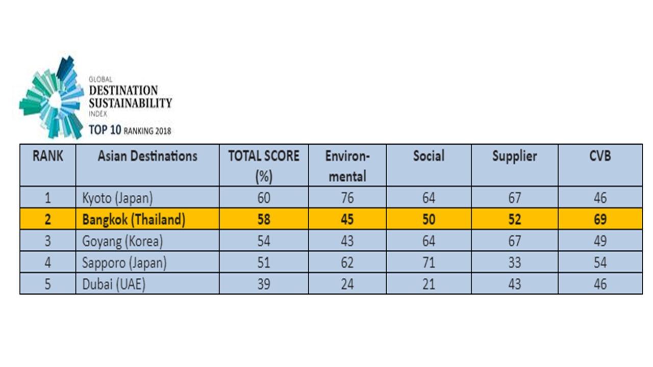 กรุงเทพมหานครได้รับการจัดอันดับให้อยู่ในอันดับ 2 ของเอเชีย และอันดับที่ 21 ของโลก ผ่านการให้คะแนนตามตัวชี้วัดทั้งสิ้น4 ด้าน ได้แก่ ตัวชี้วัดด้านสิ่งแวดล้อม (Environmental performance) 14 ข้อ, ตัวชี้วัดด้านสังคม (Social performance) 4 ข้อ, ตัวชี้วัดด้านความสามารถของการให้บริการ (Supplier performance) 8 ข้อ และตัวชี้วัดด้านความสามารถขององค์กรสำนักงานส่งเสริมการจัดประชุมของแต่ละประเทศ (CVB performance) 12 ข้อ ซึ่งกรุงเทพมหานคร ประเทศไทย ได้คะแนนรวมทั้งสิ้น58% โดยมีคะแนนสูงสุดในด้านองค์กรส่งเสริมการประชุม