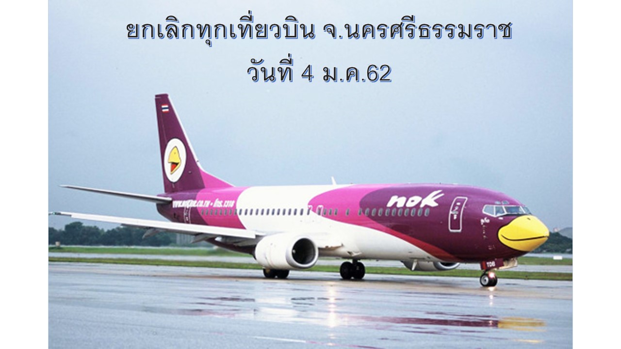 4 มกราคม 2562 : บมจ.สายการบินนกแอร์ (NOK) แจ้งว่า ตามที่กรมท่าอากาศยาน ได้ประกาศปิดสนามบินนครศรีธรรมราช ในวันที่ 4 ม.ค. 2562 ตั้งแต่เวลา 00.01 – 23.59 น. อันเนื่องมาจากการป้องกันภัยพิบัติจากพายุโซนร้อน “ปาบึก” และเพื่อความปลอดภัยของผู้โดยสาร สายการบินนกแอร์จึงมีความจำเป็นที่จะต้องประกาศยกเลิกเที่ยวบินของสายการบินฯ ที่เข้าและออกจากท่าอากาศยานนครศรีธรรมราช ในวันที่ 4 ม.ค. 2562 ซึ่งมีทั้งสิ้น 8 เที่ยวบิน