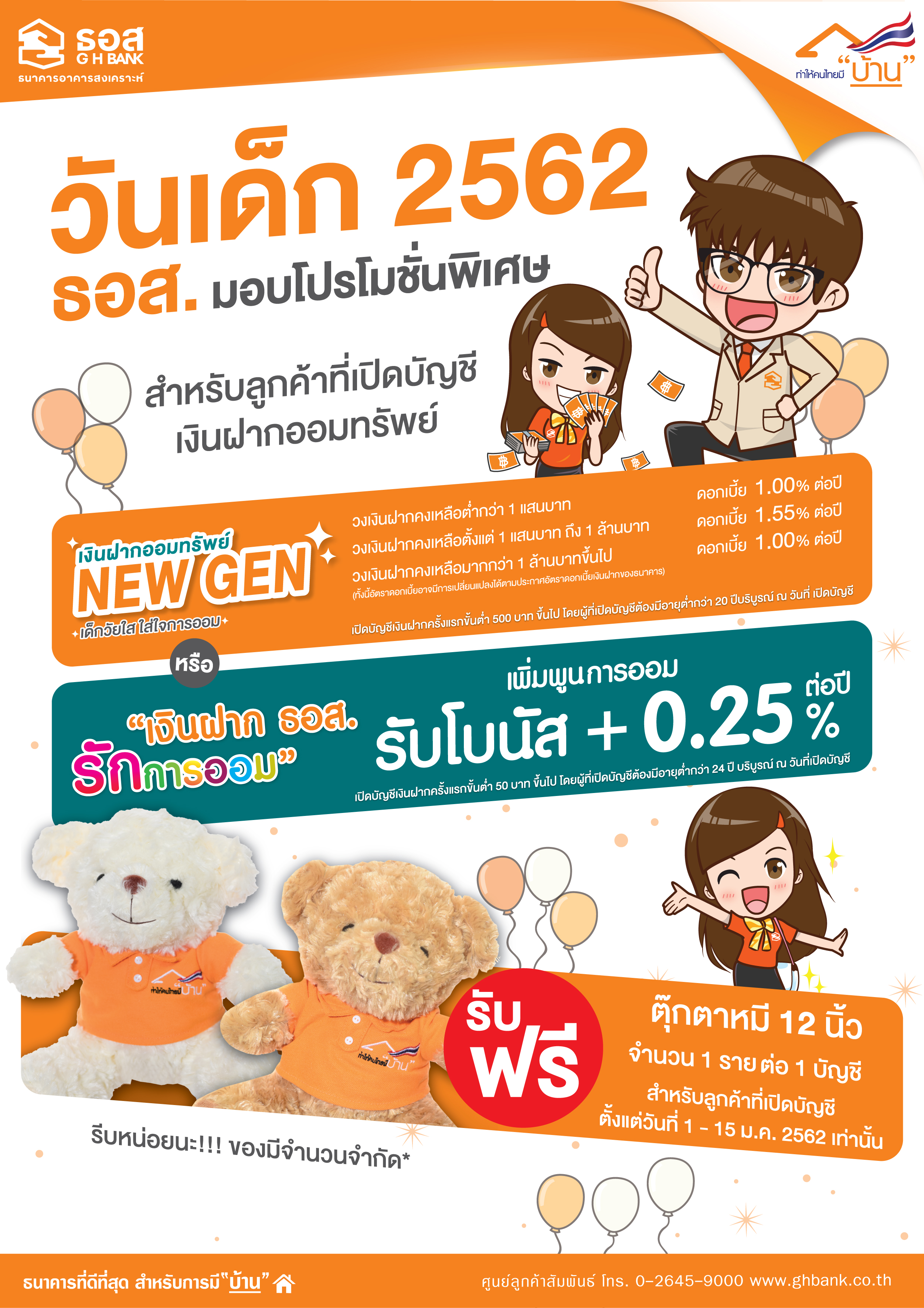 11 มกราคม 2562 : นายฉัตรชัย ศิริไล กรรมการผู้จัดการ ธนาคารอาคารสงเคราะห์ (ธอส.) เปิดเผยว่า เพื่อเป็นการสนับสนุนการออมให้แก่เยาวชนเนื่องในโอกาสวันเด็กแห่งชาติ 12 มกราคม 2562 ธอส. จึงได้จัดทำโปรโมชันพิเศษให้เยาวชน ที่เปิดบัญชี เงินฝากออมทรัพย์ New Gen รับดอกเบี้ยสูงสุด 1.55% ต่อปี