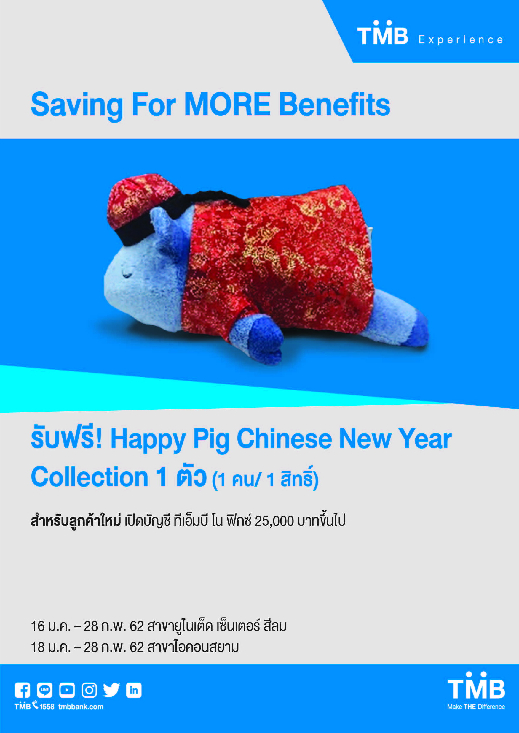 30 มกราคม 2562 : ทีเอ็มบี โน ฟิกซ์ (TMB No Fixed) บัญชีเพื่อออมที่ให้ดอกสูง 1.6% ถอนเมื่อไหร่ก็ได้ ร่วมฉลองเปิดตัว ทีเอ็มบี เอ็กซ์พีเรียนซ์ (TMB Experience) สาขาต้นแบบ (Flagship) แนวคิดใหม่ ที่เน้นมอบประสบการณ์ใหม่ในการให้บริการ ผ่านการใช้งานในรูปแบบ Edutainment ที่สอดคล้องกับชีวิตในยุคดิจิทัล ลูกค้าใหม่เพียงเปิดบัญชี ทีเอ็มบี โน ฟิกซ์ 25,000 บาทขึ้นไป รับฟรีตุ๊กตาหมูแฮปปี้ พิก คอลเลคชั่นตรุษจีน (Happy Pig Chinese New Year Collection) ผลิตจำนวนจำกัด 1 ตัว (1 คน/ 1 สิทธิ์) เฉพาะที่ทีเอ็มบี เอ็กซ์พีเรียนซ์ สาขายูไนเต็ด เซ็นเตอร์ สีลม ชั้น G และสาขาไอคอนสยาม ชั้น 5 ตั้งแต่วันนี้ ถึง 28 ก.พ. 62 นี้เท่านั้น หรือจนกว่าของจะหมด เงื่อนไขโปรโมชั่นเป็นไปตามที่ธนาคารกำหนด ![]()