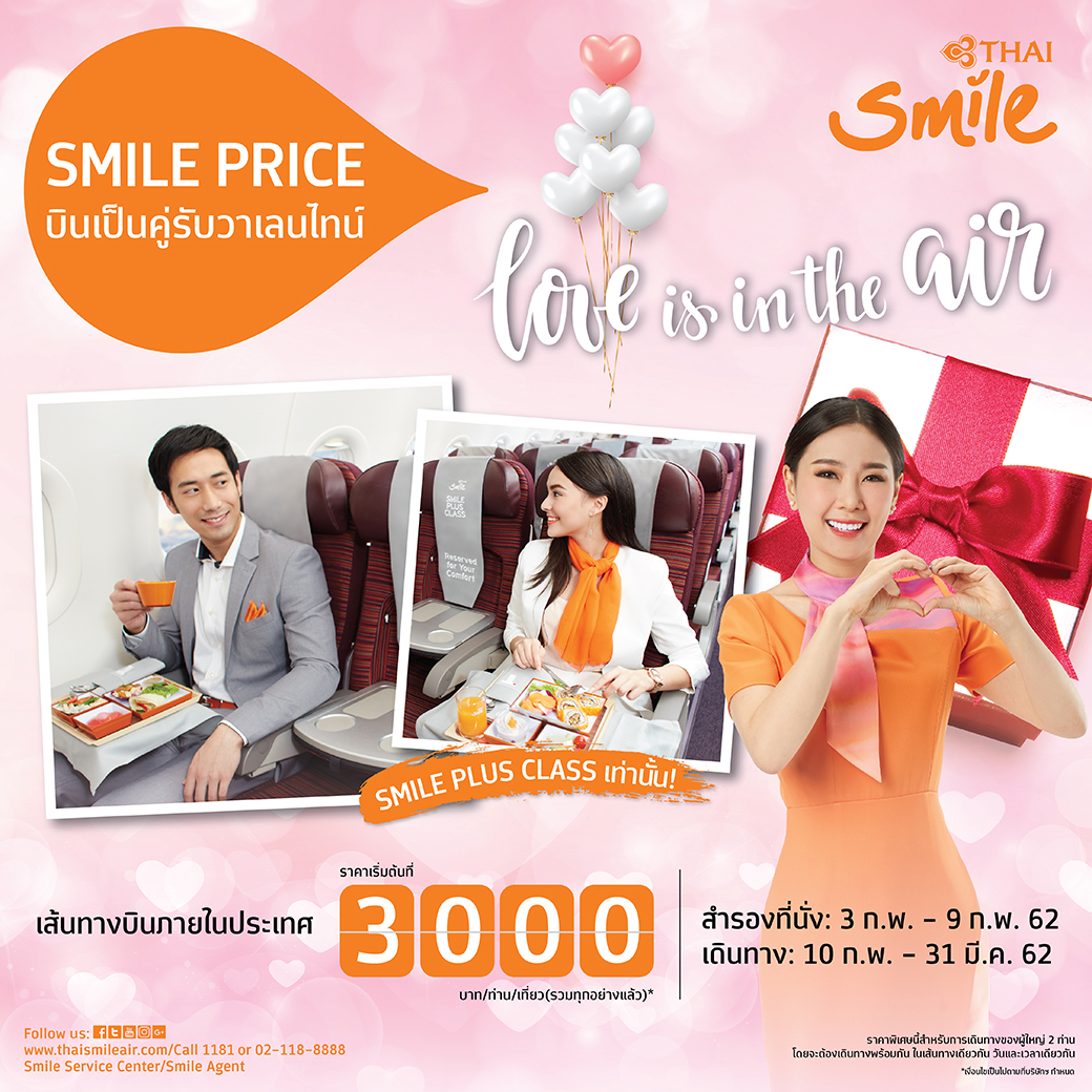 1 กุมภาพันธ์ 2562 : สายการบินไทยสมายล์เปิดให้จองบัตรโดยสารราคาพิเศษฉลองเทศกาลวาเลนไทน์ บินเป็นคู่กับบริการเหนือระดับในที่นั่งชั้นสมายล์ พลัส (Smile Plus) หรือ พรีเมี่ยม อีโคโนมี ด้วยโปรโมชั่นพิเศษ เส้นทางในประเทศ ราคาเริ่มต้น 3,000 บาท/ท่าน/เที่ยว (รวมทุกอย่างแล้ว)