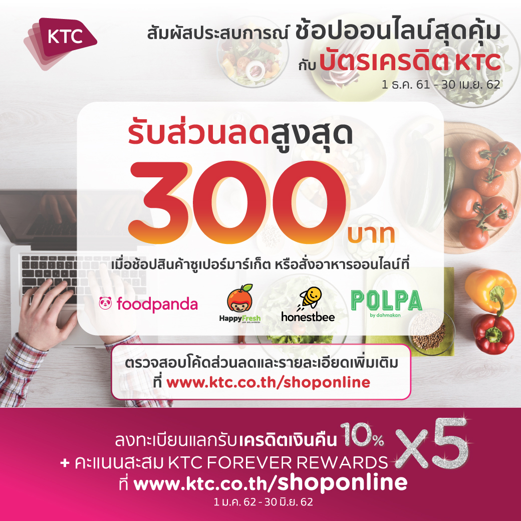 5 กุมภาพันธ์ 2562 : “เคทีซี” หรือ บริษัท บัตรกรุงไทย จำกัด (มหาชน) รับกระแสสั่งอาหารออนไลน์บูม ผนึก 4 พันธมิตรธุรกิจบริการอาหารออนไลน์ Foodpanda (ฟู้ดแพนด้า) Happy fresh (แฮปปี้เฟรช) Honestbee (ออเนสบี) POLPA (โพลพา) มอบส่วนลดสูงสุด 300 บาท ให้กับสมาชิกบัตรเครดิตเคทีซีที่ซื้อสินค้าซุปเปอร์มาร์เก็ตหรือสั่งอาหารออนไลน์ ดังนี้