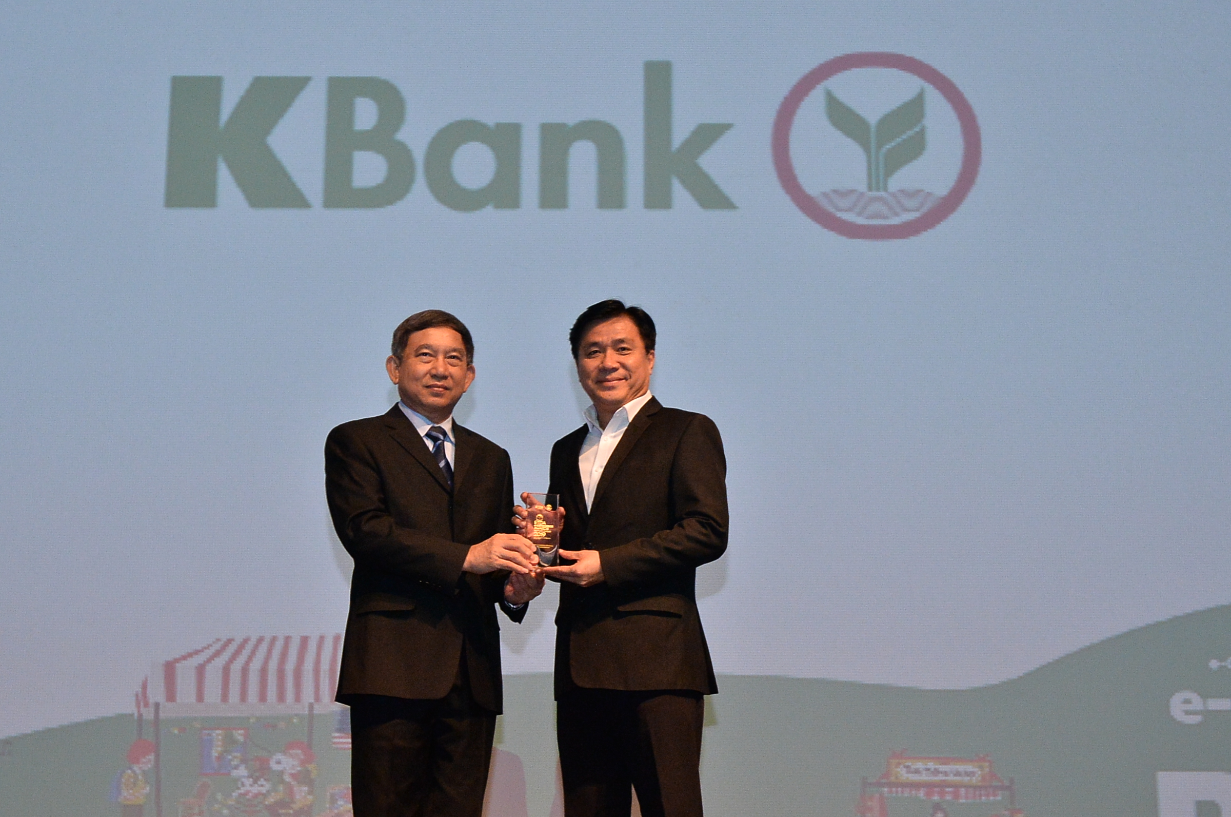 6 กุมภาพันธ์ 2562 : พลอากาศเอก ประจิน จั่นตอง (ซ้าย) รองนายกรัฐมนตรี เป็นประธานมอบรางวัล ETDA e-Commerce Awards 2019 สาขา ผู้ให้บริการชำระเงินบนช่องทางอิเล็กทรอนิกส์ขวัญใจมหาชนแห่งปี (Fans’ Favorites in e-Payment of the Year) ให้แก่ธนาคารกสิกรไทย โดยมี นายอมร สุวจิตตานนท์ (ขวา) ผู้ช่วยกรรมการผู้จัดการ ธนาคารกสิกรไทย เป็นผู้แทนรับมอบ ในฐานะผู้ให้บริการชำระเงินบนช่องทางอิเล็กทรอนิกส์อย่างสร้างสรรค์ ช่วยให้ลูกค้าซื้อง่าย จ่ายคล่อง ปลอดภัย และเข้ากับไลฟ์สไตล์นักชอปออนไลน์ ทั้งบริการชำระผ่าน K PLUS การชำระด้วยบัตรเครดิต บัตรเดบิต โปรแกรมการผ่อนชำระ ฯลฯ