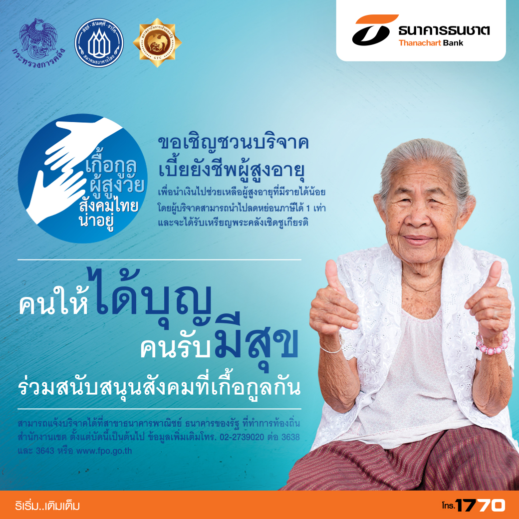 ผู้สูงอายุที่สนใจแจ้งบริจาค สามารถขอข้อมูลเพิ่มเติมได้ที่ธนาคารธนชาต ทุกสาขา โทร. 1770 หรือ สำนักงานเศรษฐกิจการคลัง โทร. 0-2273-9020 ต่อ 3638, 3643 หรือ www.fpo.go.th ![]()