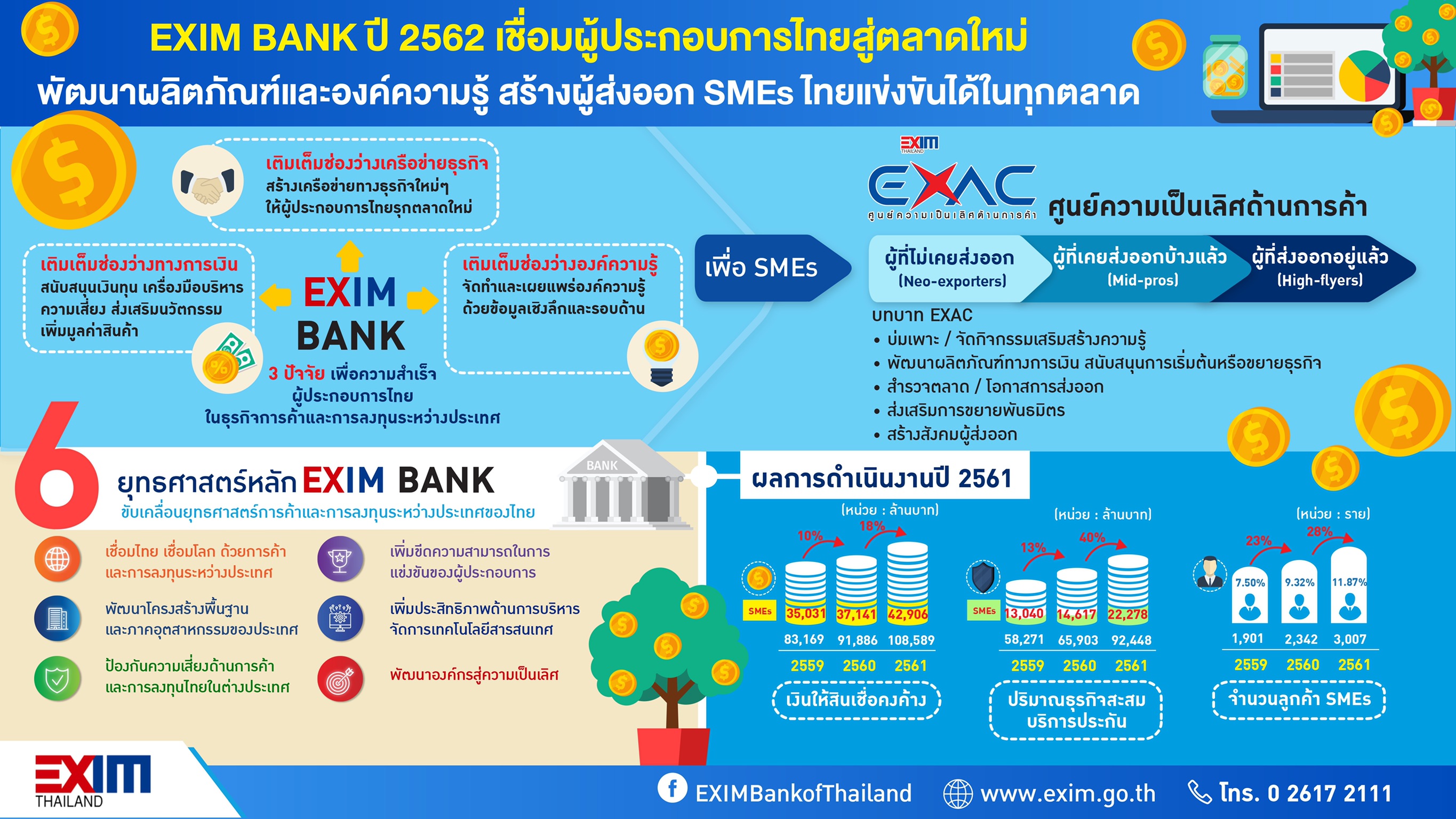 ซึ่งในจำนวนนี้เป็นปริมาณธุรกิจของ SMEs เท่ากับ 106,362 ล้านบาท ทั้งนี้ ณ สิ้นเดือนธันวาคม 2561 มีเงินให้สินเชื่อคงค้างแก่ SMEs เท่ากับ 42,906 ล้านบาท เพิ่มขึ้น 5,765 ล้านบาท หรือ 15.53% ส่งผลให้ EXIM BANK มีกำไรสุทธิ 1,365 ล้านบาท อัตราส่วนสินเชื่อด้อยคุณภาพ (NPLs Ratio) ณ สิ้นเดือนธันวาคม 2561 อยู่ที่ 3.78% โดยมีสินเชื่อด้อยคุณภาพจำนวน 4,103 ล้านบาท และมีเงินสำรองหนี้สงสัยจะสูญจำนวน 9,385 ล้านบาท เพิ่มขึ้น 1,436 ล้านบาท เมื่อเทียบกับปีก่อน โดยเป็นสำรองหนี้พึงกันตามเกณฑ์ธนาคารแห่งประเทศไทยจำนวน 4,572 ล้านบาท คิดเป็นอัตราส่วนเงินสำรองที่กันไว้แล้วต่อสำรองหนี้พึงกัน 205.25% ทำให้ EXIM BANK ยังคงดำรงฐานะการเงินที่มั่นคง