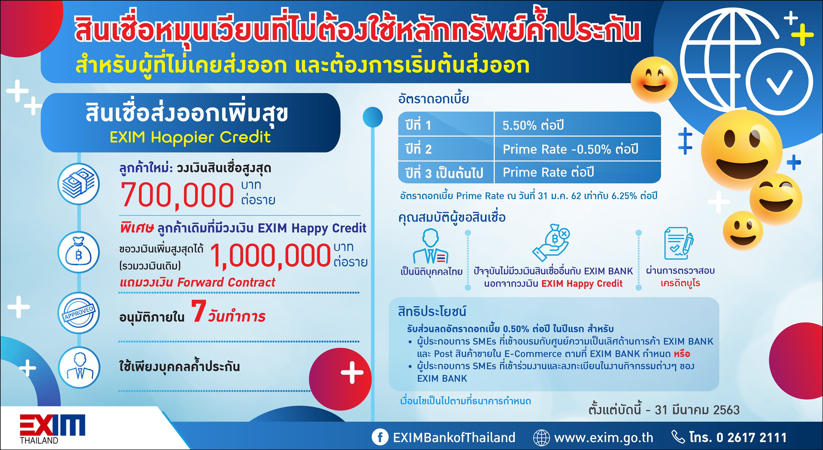 ในโอกาสครบรอบ 25 ปี EXIM BANK พร้อมนำเสนอผลิตภัณฑ์ใหม่ “สินเชื่อส่งออกเพิ่มสุข (EXIM Happier Credit)” เป็นสินเชื่อหมุนเวียนช่วงก่อนและหลังการส่งออก ผู้ที่เพิ่งเริ่มต้นส่งออก (Start up) และไม่เคยได้รับสินเชื่อจาก EXIM BANK จะได้รับพิจารณาวงเงินสินเชื่อสูงสุด 700,000 บาทต่อราย ส่วนลูกค้าปัจจุบันของ EXIM BANK จะได้รับวงเงินสินเชื่อสูงสุด 1 ล้านบาทต่อราย อัตราดอกเบี้ย/อัตรารับซื้อลด ปีแรกอยู่ที่ 5.50% ต่อปี ปีที่ 2 อยู่ที่ Prime Rate -0.50% ต่อปี (หรือ 5.75% ต่อปี) พร้อมวงเงินสัญญาซื้อขายเงินตราต่างประเทศล่วงหน้า (Forward Contract) สูงสุดเท่ากับวงเงินสินเชื่อที่ได้รับอนุมัติ