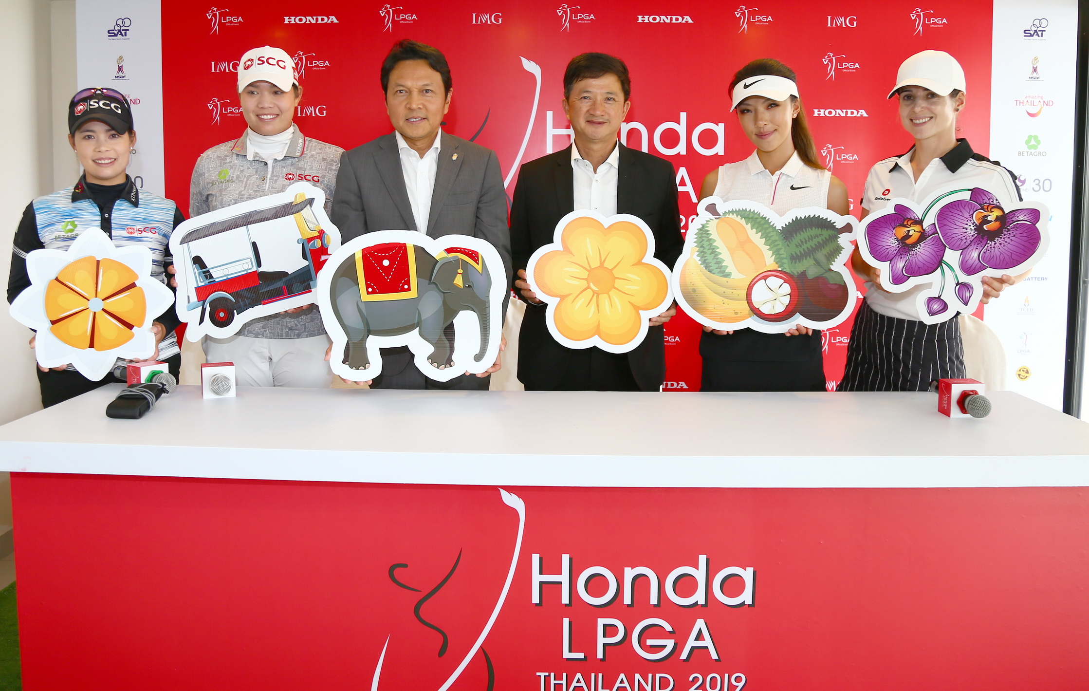 22 กุมภาพันธ์ 2562 : ธเนศวร์ เพชรสุวรรณ (ที่ 3 จากซ้าย) รองผู้ว่าการด้านสื่อสารการตลาด การท่องเที่ยวแห่งประเทศไทย, ทนุเกียรติ จันทร์ชุม (ที่ 4 จากซ้าย) ผู้อำนวยการฝ่ายกีฬาอาชีพและกีฬามวย การกีฬาแห่งประเทศไทย เชิญ 4 นักกอล์ฟหญิง โปรโม โมรียา และโปรเม เอรียา จุฑานุกาล สองโปรกอล์ฟขวัญใจชาวไทย (ที่ 1และที่ 2 จากซ้าย) มูนี่ เหอ จากจีน (ที่ 2 จากขวา) และ เบอาตริซ เรการี จากสเปน (ขวาสุด) ร่วมแถลงข่าว Amazing Thailand ที่สนามกอล์ฟ สยามคันทรี่ คลับ พัทยา โอลด์คอร์ส