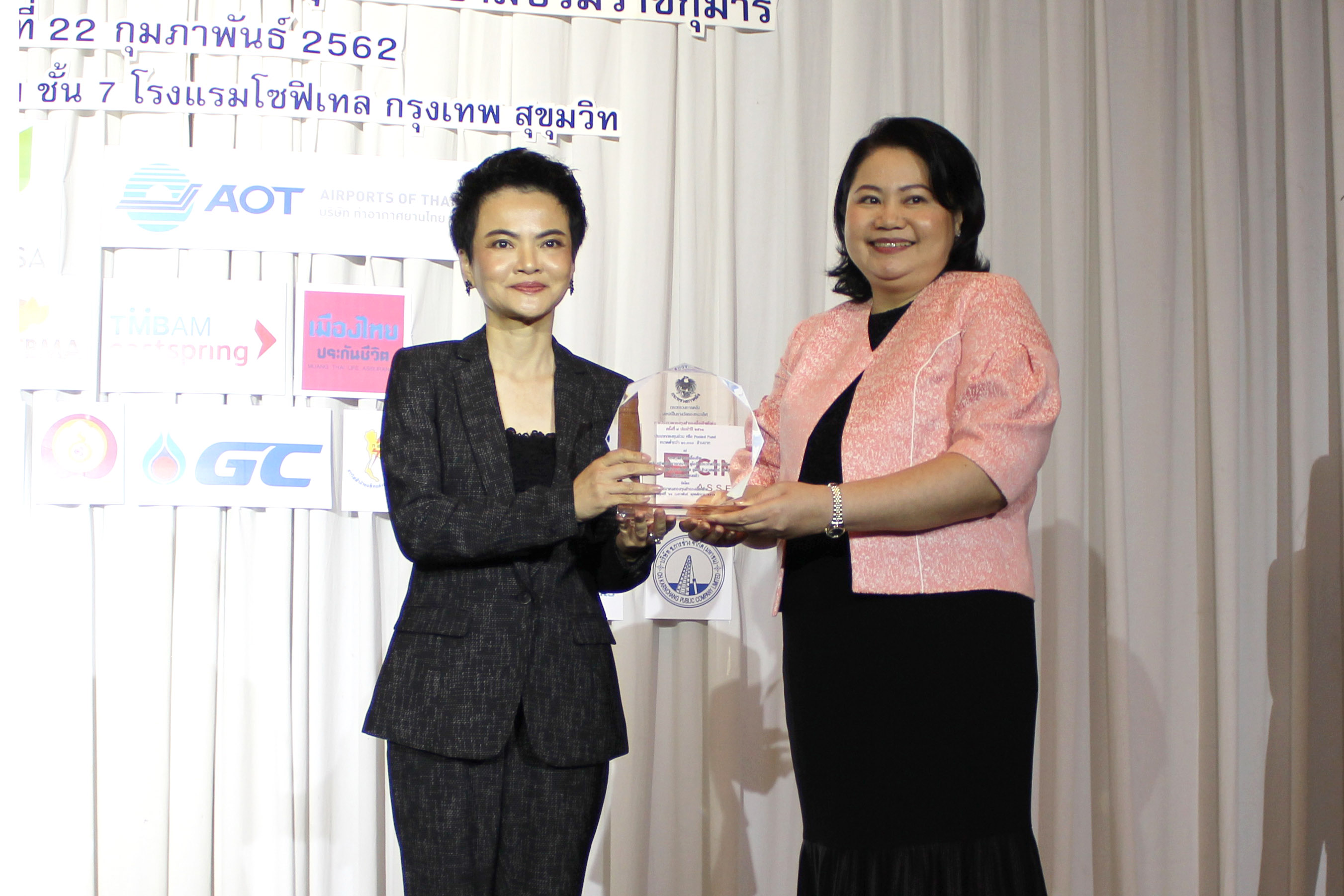 26 กุมภาพันธ์ 2562 : สาวกุสุมาพร หิรัณยัษฐิติ (ซ้าย) ผู้ช่วยกรรมการผู้จัดการ หัวหน้าฝ่ายกองทุนสำรองเลี้ยงชีพ บลจ.ยูโอบี (ประเทศไทย) จำกัด รับมอบโล่รางวัลรองชนะเลิศในโครงการประกวดกองทุนสำรองเลี้ยงชีพดีเด่น ครั้งที่ 7 ประจำปี 2561 ประเภท “Pooled Fund ที่มีขนาดกองทุนต่ำกว่า 10,000 ล้านบาท” จากกระทรวงการคลัง โดยมี นวพร วิริยานุพงศ์ ผู้อำนวยการส่วนนโยบายการออมและการลงทุนในภาพรวม สำนักงานเศรษฐกิจการคลัง กระทรวงการคลัง เป็นผู้มอบรางวัล