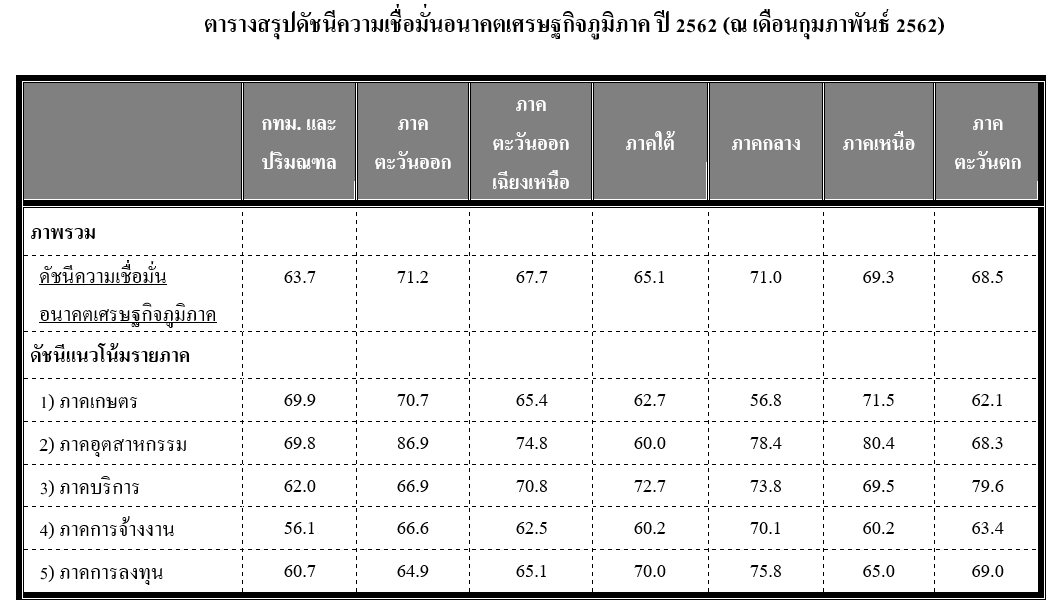 เนื่องจากการดำเนินนโยบายด้านการเกษตรเพื่อปฏิรูปกาคเกษตรที่มีมาอย่างต่อเนื่อง เช่น โครงการระบบส่งเสริมการเกษตรแบบแปลงใหญ่ ส่งผลให้แนวโน้มการจ้างงานและการลงทุนภาคเกษตรดีขึ้นด้วย สำหรับดัชนีความเชื่อมั่นอนาคตเศรษฐกิจภาคกลางขยายตัวเพิ่มขึ้นจากเดือนก่อนหน้ามาอยู่ที่ 71.0 จากแนวโน้มภาคอุตสาหกรรมและภาคการลงทุนที่ดี เนื่องจากนักลงทุนยังเชื่อมั่นในภาวะเศรษฐกิจ ทำให้ยังมียอดคำสั่งซื้อสินค้าล่วงหน้าเพิ่มขึ้น สำหรับภาคการลงทุน คาดว่าจะมีการลงทุนทั้งภาครัฐและเอกชนในโครงสร้างพื้นฐาน อีกทั้งการประกาศการเลือกตั้งทำให้นักลงทุนมีความเชื่อมั่นเพิ่มขึ้น